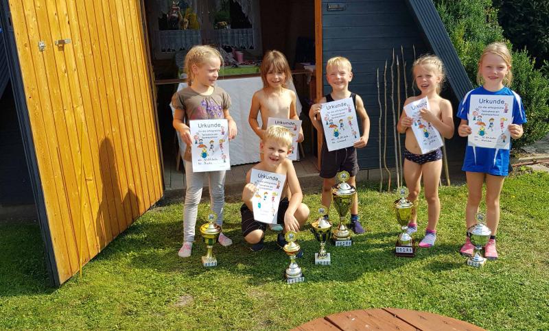 Nach der ersten Übernachtung im Schlafsack, garniert mit einer Nachtwanderung, stand am zweiten Tag ein Kindersportfest mit sechs Disziplinen auf dem Programm. Spiele wie Socken-Zielwerfen, Teebeutelweitwurf, Büchsenwerfen, Torwandschießen (daraus wurde dann aber Torwandwerfen), Wasserpistolen-Zielspritzen und Dart. Jeder Einzelne wurde dabei lautstark angefeuert und es wurde viel gelacht. Die Spaß-Olympiade fand nach etwa zwei Stunden ihren Abschluss mit einer Siegerehrung der etwas anderen Art. So gab es keine Verlierer, sondern nur Gewinner. Aber eine Reihenfolge musste es dennoch geben. Jeder bekam eine Teilnehmerurkunde und der Kleinste bekam den größten Pokal und der Größte bekam den kleinsten Pokal.