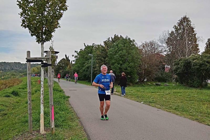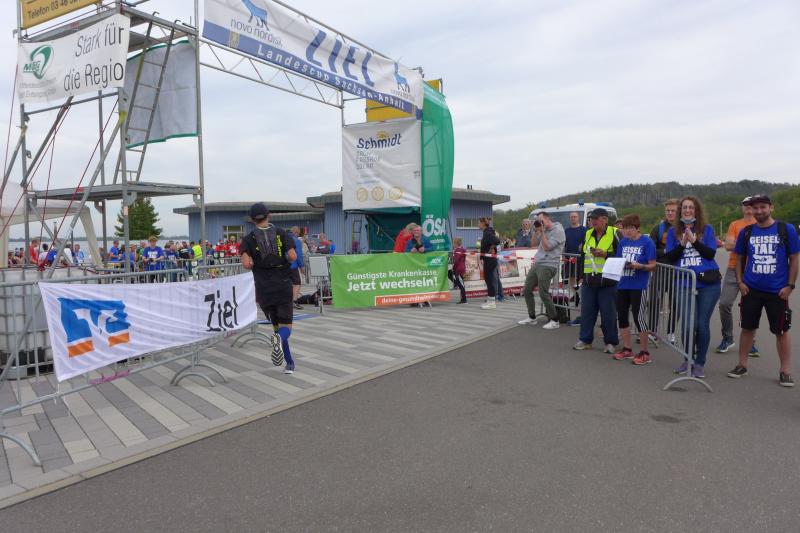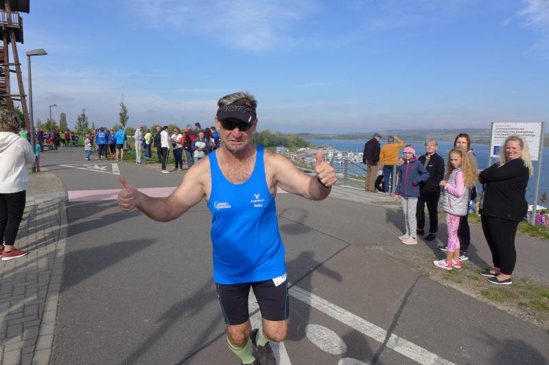 Erst um die Mittagszeit erfolgte der Aufruf für die 225 Halbmarathonis. Die Erwärmung ersparten sich die drei Lauffreunde Olaf Bothe, Jan Zaschke und Jens-Uwe Börner, denn die ellenlange Treppe hinauf zum Startpunkt war vollkommen ausreichend. Sie hatten auf die Länge von 21,1 Kilometer nicht unbedingt trainiert und auch die Zielzeit war fast nebensächlich. Wahnsinnig scharf war man allerdings auf die tolle Glasmedaille. In Bothe reift außerdem das Langzeitprojekt Frühjahrs-Marathon, so dass ein Test über die halbe Distanz ein erster Meilenstein war. „Da begleiten wir dich Kumpel, den musst du nicht alleine laufen!", wurde die Anmeldung zum Geiseltalseelauf vor einigen Wochen fest gemacht. Doch durch Corona waren die drei in ganz unterschiedlichen Startgruppen eingeteilt, so dass jeder für sich alleine lief. Nach neun absolvierten Kilometern konnte man den Läufern nochmal in die Augen schauen, denn sie passierten erneut das Besucherzentrum Marina. Nun ging es in die andere Richtung nach Mücheln, wo wieder gewendet wurde. Vorbei an Neubiendorf nahm man den Schwung hinab zum Hafen bis in das ersehnte Ziel mit. Endlich wieder vereint, schnappte Börner nach Luft: „Ich dachte ich kriege euch noch für ein gemeinsames Zielfoto!“ Egal, gelang dies doch inklusive der wohl verdienten Glasmedaille auch nach dem Zieleinlauf. Schmerzlich vermisst wurden allerdings das leckere Kuchenbuffet und die sonst so festliche Siegerehrung im großen Veranstaltungszelt. Erst zu Hause am heimischen Rechner waren die Ergebnisse dann einzusehen.