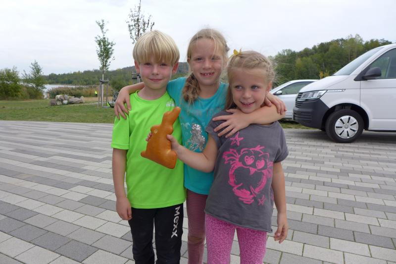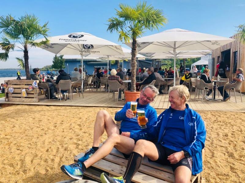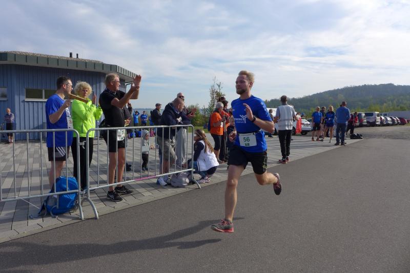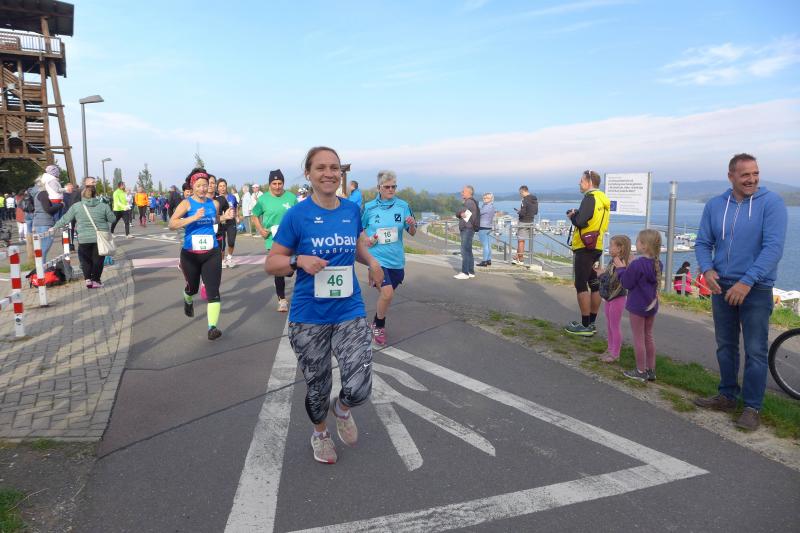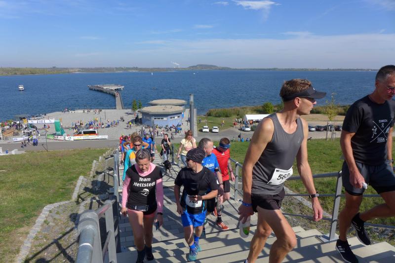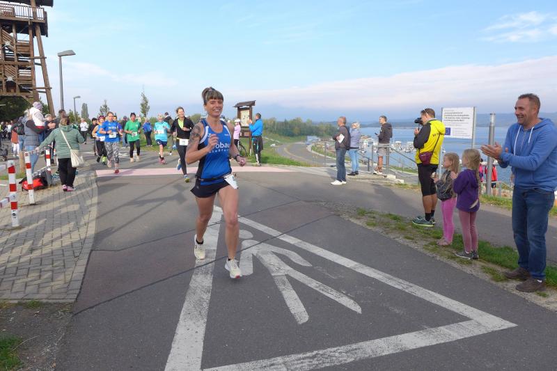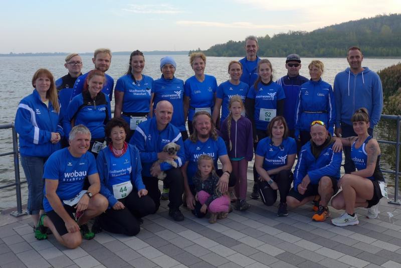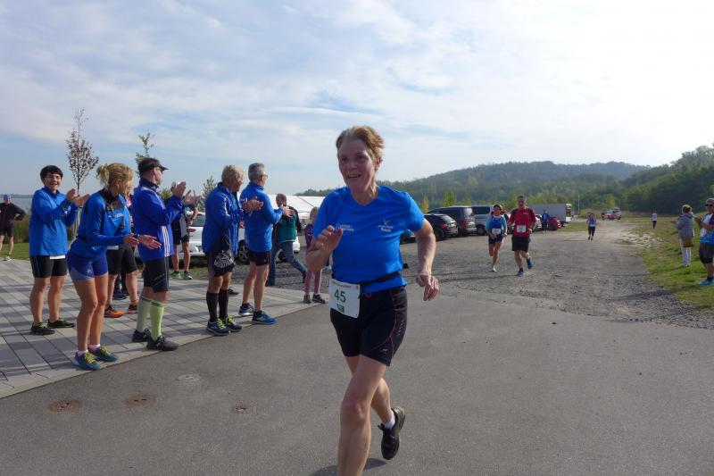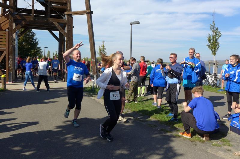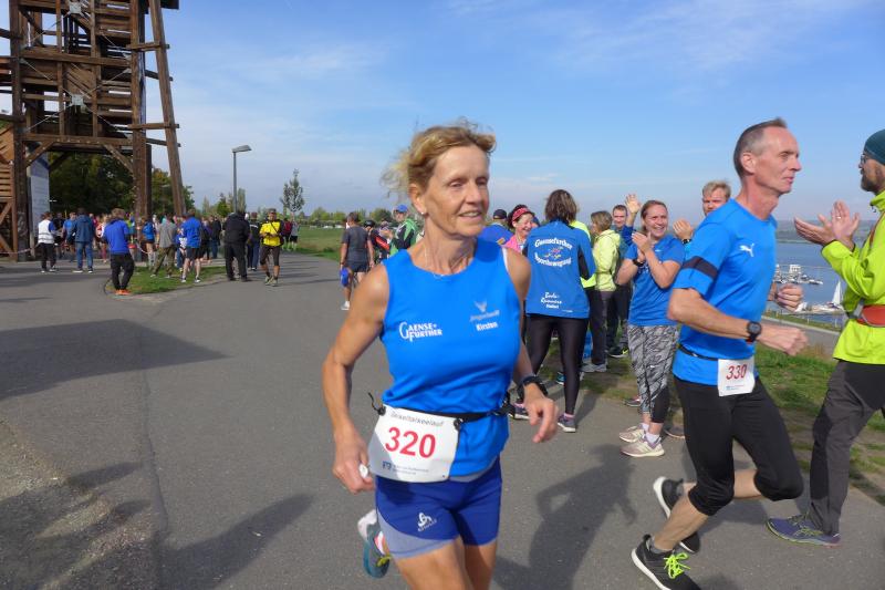 Vom Aussichtsturm „Leonhardt“ gingen jeweils zehn Starter im Minutentakt auf die Reise. Elf Gaensefurther waren auf der Kurzstrecke mit dabei. Da hatten es die Fahrgäste im Geiseltal-Express doch etwas bequemer. Unbeeindruckt und manchmal gefährlich nahe, zog die bunte Kleinwegebahn an den Läufern vorbei. In leichten Wellen ging es auf dem Geiseltalrundweg entlang, bevor die letzten drei Kilometer direkt am See zurückführten. Nach dem großen Zielbogen am Besucherzentrum Marina wurden alle Finisher herzlich begrüßt. Zehn Sekunden schneller als im vorigen Jahr, fuhr Sandra Homann (1. Platz Altersklasse W40) im vereinsinternen Duell den Sieg für sich ein, gefolgt von Jana Berger (1. Platz W50) und Janine Wuwer (3. Platz W35).