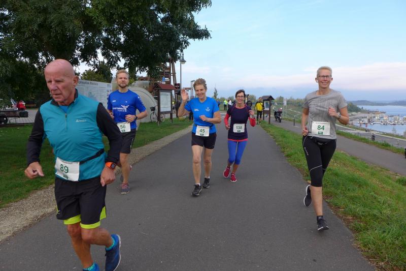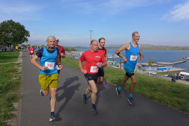 Erstaunlich ruhig und bei bestem Laufwetter präsentierte sich der Geiseltalsee am Feiertag der Deutschen Einheit. Da waren die Bode-Runners der Gaensefurther Sportbewegung in den zurückliegenden Jahren schon ganz anderen Wetterkapriolen ausgesetzt. Erste Aktion war also ein Gruppenfoto vor der beeindruckenden Kulisse. Kaum vorstellbar, das noch bis in das Jahr 2010 eine 16 Kilometer lange Pipeline den Geiseltalsee mit Saalewasser flutete. Als Veranstalter hatte der SV Braunsbedra das Hygienekonzept fest im Griff und konzentrierte sein Augenmerk auf die Durchführung der drei Hauptstrecken über 6,5 Kilometer, elf und 21,1 Kilometer.