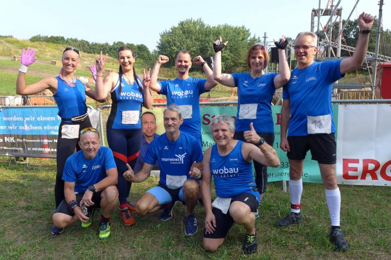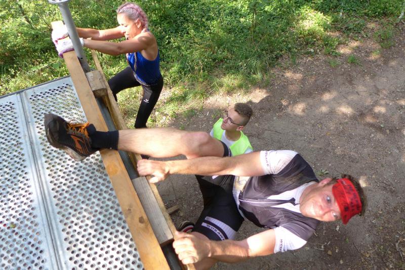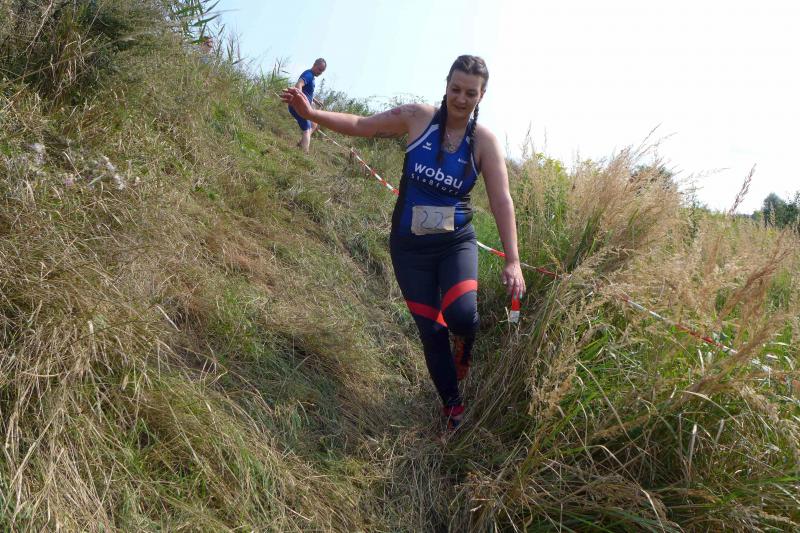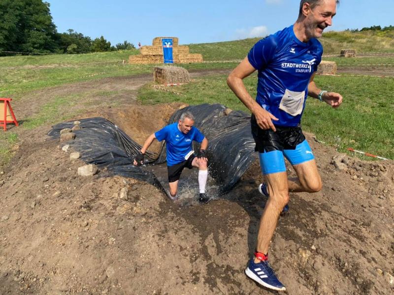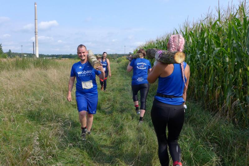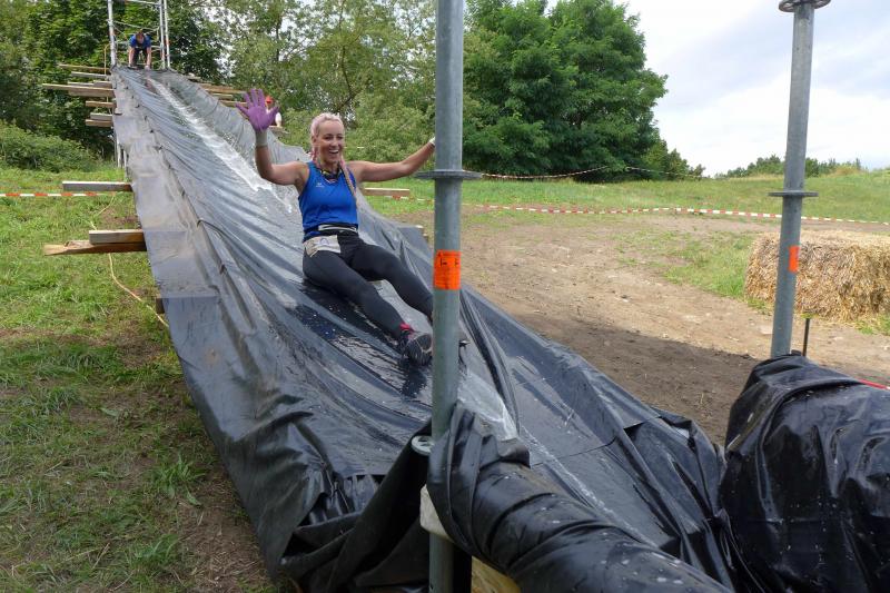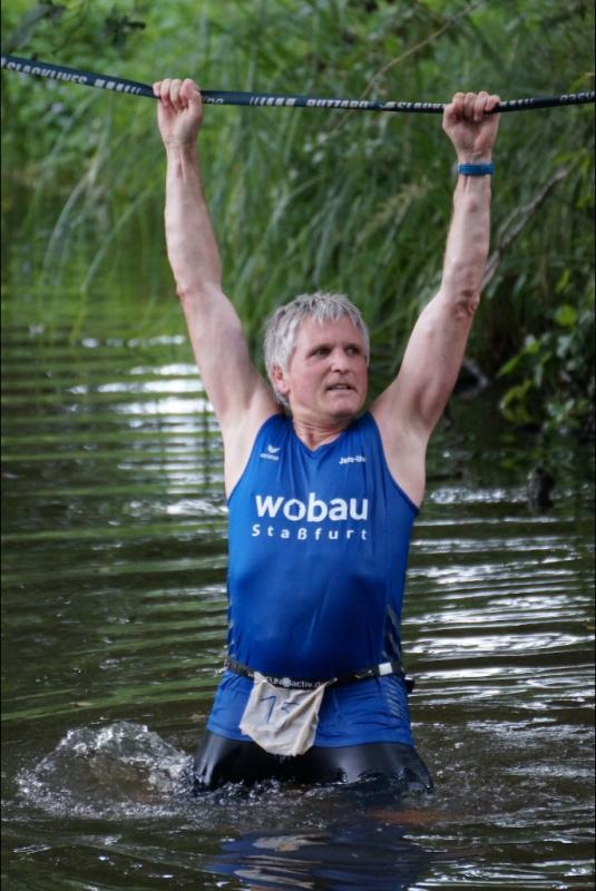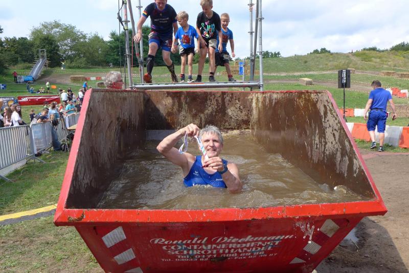 Umso mehr feierten die Gaensefurther ihre Schönherrs, als diese zur zweiten Runde aufbrachen. Dabei waren die insgesamt 44 Hindernisse oft nur durch teambildende Maßnahmen zu bezwingen. Gleich in der Arena, die traditionell eigentlich dem Rasentraktorrennen vorbehalten ist, konnten die Zuschauer die Bewältigung von Kriechgang, Strohballen, Kletterseil und Hangelanlage verfolgen. Nach der ersten Matschepfütze ging es dann im Tauchgang durch einen Container voller Wasser. Finzelberg hatte vorgesorgt, zauberte ihre Schwimmbrille hervor und hatte wieder alle Lacher auf ihrer Seite. Klitschnass kämpfte sich die Truppe dann durch stachliges Gestrüpp, wo nur ein wild verlegtes Flatterband den Weg aus dem dichten Wald verriet. Hier war nicht an Laufschritt zu denken, man musste eher koordinieren wo der nächste Schritt hingehen sollte. Nach Sandsack- und Holzstammschleppen und fast trocken hinter den Ohren, folgten die nächste Flussdurchquerung mit Fässern und ein Herüberhangeln an einem Seil. Alle möglichen Techniken wurden ausprobiert, alle landeten meist wieder im drohenden Nass. Den nächsten Steilhang hoch und auf`m Hintern wieder runter, bevor erneut der Kanalzubringer durchschwommen werden musste. Der abenteuerliche Ausstieg über das Brückengeländer gelang mit hilfreichen Händen besser, bevor der Puls auf der anschließenden Laufeinheit entlang des Elbe-Havel-Kanals langsam wieder zur Ruhe kam. Nach bezwungener Spundwand wurde die Arena kurz angelaufen und mit dem Jubel der Zuschauer verschwanden „SchlammBada“, die „Dreckschweine Rhinow“ und auch die „Matschgänse“ noch einmal hinter dem Genthiner Rodelberg, um schwere Autoreifen von A nach B zu transportieren. „Es kam uns jetzt viel schneller vor!“, resümierten die tropfnassen Schönherrs, die erst noch ihre Medaillen in einem Tauchgang aus dem großen Wassercontainer fischen mussten. Ob das nun daran lag, dass man die Hindernisse in der zweiten Runde besser bewältigen konnte oder dass zwei Flaschen Spülmittel auf der Rutsche ihre Finisher schneller ins Ziel beförderte? „Großartig - ihr habt das komplette Ding durchgezogen!“, wurden Aileen und Jörg von den wartenden Bode-Runners mit Handschlag im Ziel begrüßt!