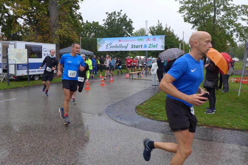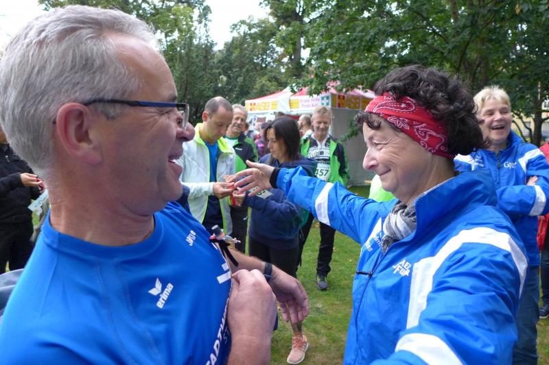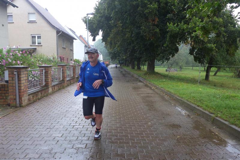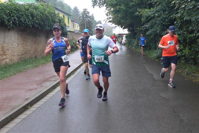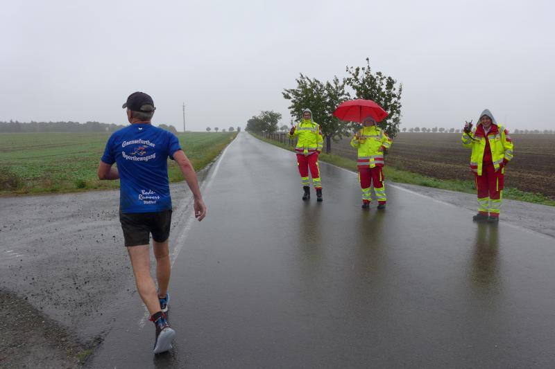 Die LSG Ascania schaffte mit ihrem neuen Start- und Zielbereich an der Herrenbreite eine besondere Atmosphäre zur 40. Jubiläumsauflage und bei der Größe der Parkanlage, war das pandemiebedingte Abstandhalten auch kein Problem. Nur den anhaltenden Regen hätten sich eine Woche zuvor wohl eher die Veranstalter der Genthiner Matschwolke gewünscht. Aber bekanntlich kommen ja nur die Harten in den Garten und so pfiff Paparazzi Börner seine Bodis im feinsten Nieselregen zur Fotoaufstellung vor dem Startbogen zusammen. „Leute, die Matten sind scharf!“, hallte es aus dem Messwagen der Zeiterfassung. Wie ein aufgescheuchter Hühnerhaufen sortierten sich die Lauffreunde entfernt der verlegten Messschleife neu, denn ein Kontakt hätte die Ergebnislisten der bereits gestarteten Walker arg durcheinander bringen können. Schnell noch ein Geburtstagsständchen für den Jürgen, der sich sehr über die vorgezogenen Starts und die damit näher rückende Kaffeerunde freute. Nahe am Ehekrach schrammte ein Bode-Runner-Pärchen vorbei, die es gerade noch schafften ihre Startunterlagen abzuholen: „Du musst auf die Laufstrecke!“, schickte sie den Gatten los, der nun zwölf Kilometer vor sich hatte, um das angestaute Adrenalin abzulaufen. Bei all der Aufregung geriet fast der Start von Debütantin Anke Delius ins Hintertreffen. Wie ein Routinier reihte sie sich aber in die lange Startaufstellung ein und zog ihre sieben Kilometer ruhig und ohne Gehpausen durch. Das kontinuierliche Training mit der Laufgruppe zeigte erste Erfolge und Delius lief nicht ohne Stolz über die Ziellinie. Nach langer Verletzungspause und mit etlichen Gehpausen über diese Distanz, war Sabine Börner wieder mit von der Partie. Einzig allein der dadurch errungene Mannschaftspunkt war das Ziel. Doch das gute Mannschaftsgefühl und die Tatsache, dass es langsam wieder aufwärts geht, waren allemal Lohn für die Quälerei. In Bestform und als schnellste Gaensefurtherin auf der Sieben-Kilometer-Distanz unterwegs, spulte Janine Wuwer ihr Rennen ab. „Das ist mein Wetter!“, freute sich die Sportlerin dann auch noch über ihren ersten Platz in der Altersklasse W40. Als „langer Kanten“ musste beim Jubiläumslauf die 18,5 Kilometer lange Strecke reichen. Führte 2019 der 25-Kilometer-Kurs noch über die Burg Arnstein, ging es diesmal schon kurz vor Welbsleben zurück, oft am Flüsschen Eine entlang, direkt wieder in das Zentrum von Aschersleben. Okay, die Strecke war kürzer aber dennoch sehr anspruchsvoll. So berichteten einige Finisher, dass sie auf Grund der Nässe die Wegmarkierungen nicht erkannten und dadurch einige Kilometer mehr zusammen kamen. Die aufgeweichten Sommerwege sorgten indes für abenteuerliche Rutschpassagen. Umso intensiver waren die Erfolgserlebnisse und die Streckenberichte dann im Ziel.