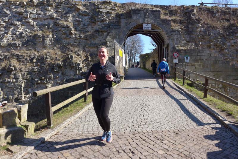 Schnellste Läuferin der Boderunners war Sandra Homann, die ihre Eindrücke so zusammen fasste. "Berge ohne Ende hochlaufen ist nicht mein Ding, bergrunter ist eher meine Stärke, da fliege ich. Die Kombination der unterschiedlichen Laufwege war eine extreme Herausforderung und macht diesen Lauf so besonders. Das Highlight war, oben an der Burgruine anzukommen, was schwer genug war und dann das Rennen zu genießen. Sand und Waldwege gespickt mit Wurzeln wechselten sich mit gepflasterten Wegen ab. Du musst hier extrem konzentriert Laufen, langweiligen Asphalt gibt es nicht. Das gibt diesem Lauf den besonderen Kick." Da auch Sandra im Vorfeld erkrankt war, ist ihre Leistung ebenso stark und mit einem 2. Platz in ihrer Altersklasse gekrönt worden.