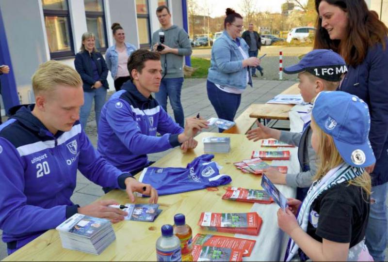 Leni und Felix konnten es am Mittwoch kaum erwarten, die begehrten Autogramme von FCM-Kapitän Tobias Müller und Abwehrspieler Julian Rieckmann zu bekommen. Die Profis vom Tabellenführer der 3. Fußball-Bundesliga waren nach Staßfurt gekommen, um auf den 4. Salzlandlauf aufmerksam zu machen.