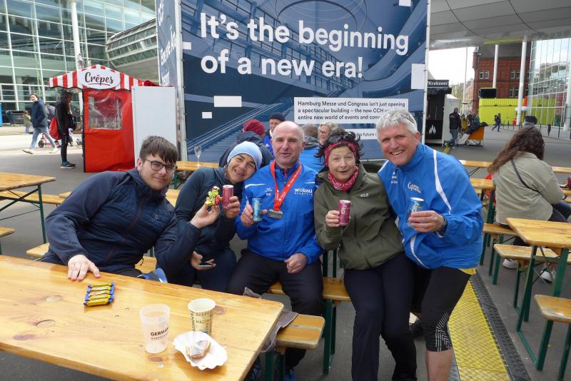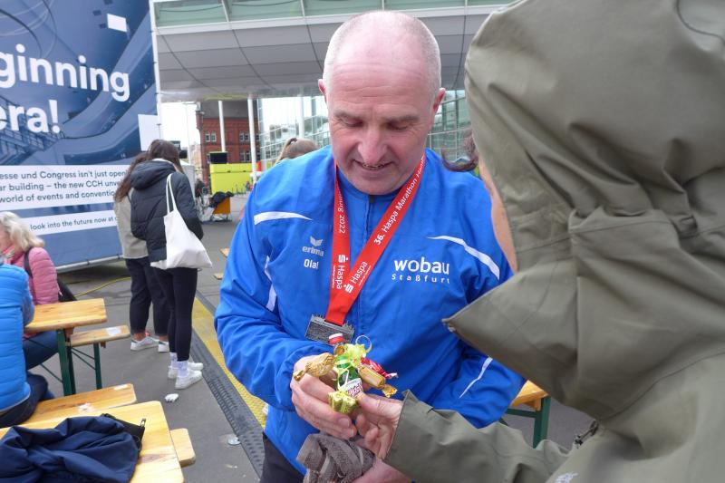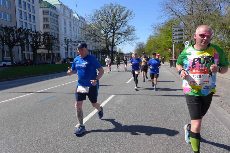 Nach coronabedingter Zwangspause im vorigen Jahr, war der Startplatz für Bothe in 2022 quasi reserviert. Da mussten die aktuellen Wettkämpfe erstmal mit dem Trainingsplan abgestimmt werden. Doch der Halbmarathon in Berlin und ein abschließender 30 Kilometer-Lauf auf heimatlichen Wegen, waren dann Vorbereitung genug. "Bist du aufgeregt?", fragte der mitgereiste Fanclub nach dem Einchecken im Hotel? "Nicht die Bohne", lauschte Bothe in sich hinein. Spätestens als er dann die Startnummer in den Händen hielt, stieg die Anspannung auch bei dem Debütanten. Über die Streckenlänge von 42,195 Kilometer ist Bothe noch nie am Stück gelaufen. Durchhalten und ankommen war das ausgemachte Ziel, eine Zeitvorgabe wollte Bothe sich nicht machen. Während dem Lauffreund frühzeitiges Zubettgehen ans Herz gelegt wurde, studierte Jens-Uwe Börner U-Bahn-, Zeit- und Streckenpläne entlang des Marathons. Mit einer Tageskarte der Bahn, ließ sich der zuschauerfreundliche Kurs mehrfach ansteuern. War das Läuferfeld erstmal unterwegs, hatte Börner insgesamt fünf Zwischenstationen ausgemacht, um Bothe an der Strecke abzupassen, ein Stück mitzulaufen und mit zunehmenden Kilometern natürlich zu motivieren. Und dann war Bothe endlich unterwegs. Die Tränen von Ehefrau Nancy trockneten andere Bode-Runners: "Er schafft das! Er ist gut trainiert und er hat Spaß auf der Strecke!", beruhigten die Lauffreunde, nachdem der Startschuss so viele Emotionen freigesetzt hatte. Wie vereinbart, verteilte sich die mitgereiste Fangemeinde an der 42 Kilometer langen Partyzone. Nachdem die Führungsfahrzeuge für die Profis auf der Strecke Platz gemacht hatten, folgte der nicht abreißende Strom der Volksläufer. Da brauchten auch die zahlreichen Zuschauer an der Strecke eine ordentliche Portion Ausdauer für ihr Motivationsprogramm. Bei den ersten beiden Anlaufpunkten hatte Börner Glück, denn Bothe war eigentlich zu schnell unterwegs und viel zu zeitig am anvisierten Streckenpunkt. Die Stimmung war einmalig: „Adrenalin ohne Ende!“, klatschte Bothe seinen Streckenmotivator ab und ließ sich vom Strom mitziehen. Reeperbahn und Elbchaussee lagen hinter ihm, als mit den Landungsbrücken ein weiteres Highlight anstand. Die Familie konnte das Oberhaupt in der Menge ausfindig machen und feierte ihn noch vor der imposanten Elbphilharmonie. Hafencity und Speicherstadt durften nicht fehlen, bevor Bothe von der Kennedybrücke den tollen Blick über die Binnenalster wahrnahm.