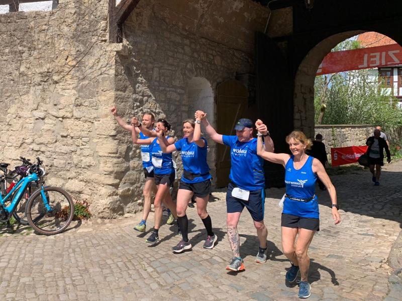 Auch der beliebte Huy-Burgenlauf im Harzvorland gehört bei der Gaensefurther Sportbewegung schon seit Jahren zum Programm. Während am Sonnabend mehrere Etappen über eine Gesamtlänge von 32 Kilometern absolviert werden mussten, stand am Sonntag eine letzte kleinere Etappe über 21 Kilometer an. Oliver Klepsch, Nicole Schlottag, Anke Delius, Olaf Bothe und Kirsten Geist stellten sich der Herausforderung und konnten sich, nachdem die Mammutdistanz von insgesamt 53 Kilometern geschafft war, über ein traditionelles Highlight des Huy-Burgenlaufes freuen: den feierlichen Ritterschlag. Diesen erhält nur, wer die komplette Strecke bewältigt hat. In diesem Jahr konnten die Bode-Runners mit Olaf Bothe und Anke Delius zwei neue „Ritter“ in ihrer Runde begrüßen.