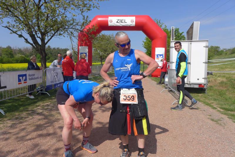 Bereits am nächsten Tag waren die Gaensefurther wieder mal beim befreundeten PSV Bernburg zu Gast. Dieser hatte zum 5. Bernburger Halbmarathon geladen, der zudem in die Wertung für den Solvay Cup einging. Mit Triathlet Maik Löwe, Josef Hindricks, Rinaldo Schielke, Sandra Homann, Edgar Schmidtke, Katrin Winkler-Hindricks, Heike Lenz, Jens-Uwe Börner, Verena Hildebrandt, Peter Brauer, Petra Becker und Jürgen Günther schickten die Bode-Runners ein zwölfköpfiges Aufgebot in die Kreisstadt. Dort konnten Strecken über zwölf beziehungsweise 21,1 Kilometer absolviert werden. Besonders Schielke ging dabei wieder fleißig auf Punktejagd und wurde in 1:36:49 Stunden über die Halbmarathon-Distanz Gesamtzwölfter und Dritter seiner Altersklasse M30. Am Streckenrand gab es zudem das eine oder andere bekannte Gesicht zu sehen, denn die Streckenposten vom PSV Bernburg waren für die Bode-Runners natürlich keine Unbekannten.
