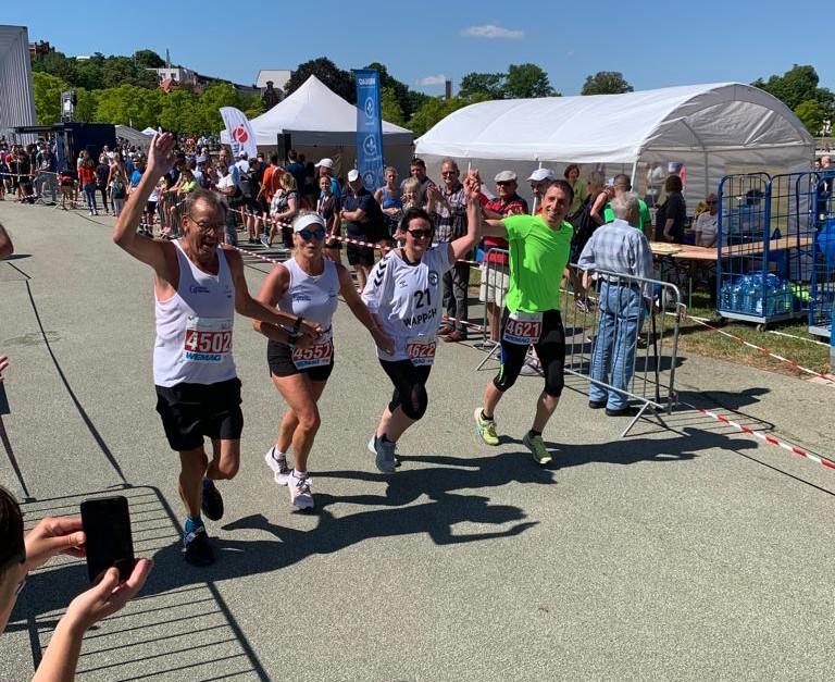 "Schon wieder kommt ein Gaensefurther ins Ziel!", hörten die Bode-Runners mit geschwollener Brust den Moderator gerne sagen, bevor die letzten Schritte bis zur Ziellinie unter dem Beifall der zahlreichen Zuschauer erfolgten. Immerhin strahlten 13 leuchtend blaue Shirts der Gaensefurther Sportbewegung mit der Schweriner Sonne bei warmen 26 Grad um die Wette. Das Ausdrücken der Laufuhr und der obligatorisch, auswertende Blick auf Zeit, Distanz und Durchschnittsgeschwindigkeit gehörte ebenso zum Ritual, wie das Abklatschen der Lauffreunde, mit denen man unterwegs so viele Kilometer gemeinsam gekämpft hatte.