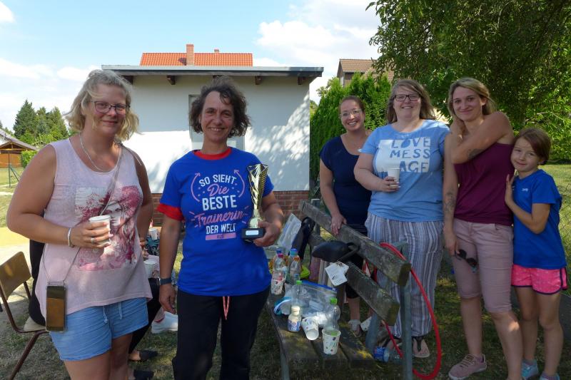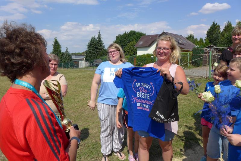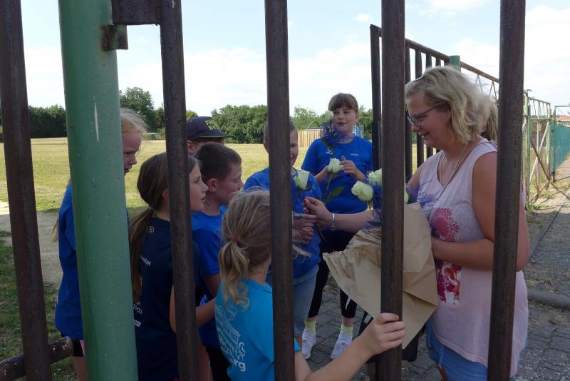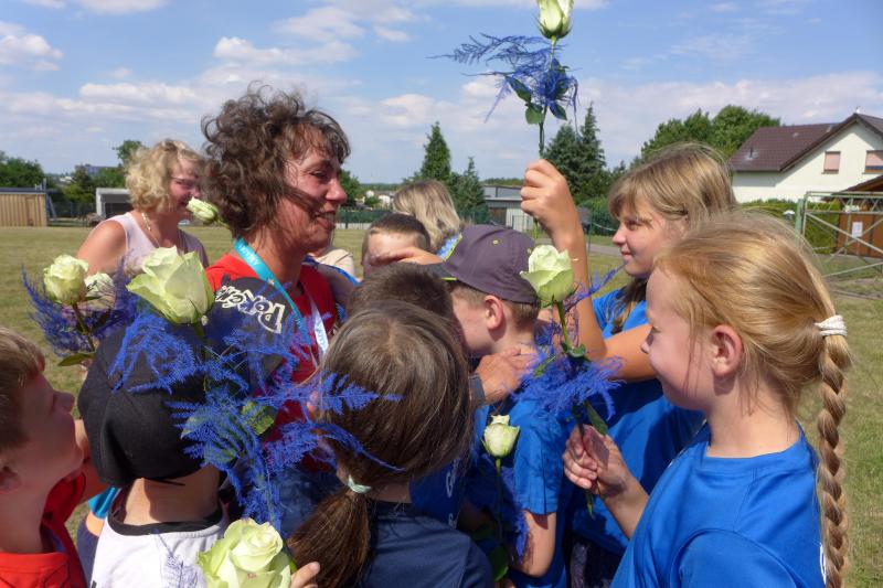 Einen tragischen Verlust muss indes die Kinder-Trainingsgruppe der Gaensefurther Sportbewegung verkraften. Mit den letzten Schultagen endete für die elf Kinder von sieben bis zehn Jahre das Training mit ihrer Silke. Der Umzug in eine andere Stadt ist leider nicht abzuwenden. Dabei hatte sie mit Überbringung dieser traurigen Tatsache wohl am meisten zu kämpfen. Als die Kinder und Eltern die langjährige Übungsleiterin zur letzten Trainingseinheit nun mit einer kleinen Abschiedsfeier überraschten, nahmen die Tränen ihren Lauf. Jedes Kind verabschiedete sich mit einer Rose, natürlich in den Gaensefurther Vereinsfarben blau/weiß. Ein Erinnerungs-T-Shirt für die beste Trainerin der Welt und ein Pokal durften natürlich nicht fehlen. Auch Vertreter der Laufgruppe überbrachten im Namen des Vorstandes ein kleines Dankeschön für die wichtige Arbeit mit den Kids. Silke Vorrath versteht es gut, das Einmaleins der Leichtathletik neigungs-, altersgerecht und spielerisch zu vermitteln. Mit den Sportanlagen rund um die Hecklinger Grundschule hat die temperamentvolle Kindergruppe auch alle Möglichkeiten für ein abwechslungsreiches Training. Doch wie kann es nun weitergehen? Diese Frage wüsste auch Vorrath allzu gerne beantwortet. Im Moment steht ein Übungsleiter-Papa in den Startlöchern, der erstmal alle 14 Tage das Dienstagstraining übernehmen wird. Freiwillige vor, die Gaensefurther Sportbewegung und allen voran die Kinder-Leichtathletikgruppe, sucht dringend nach ein, besser zwei tatkräftigen Unterstützern. Interessenten melden sich sehr gerne direkt bei der Kindergruppe, die immer dienstags ab 15:30 Uhr trainiert oder per E-Mail bei den Bode-Runners unter laufgruppe@gaensefurther-sportbewegung.de, damit ein kräftiges "Sport frei!" weiterhin für Begeisterung bei dem Sportlernachwuchs sorgt...