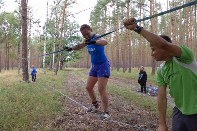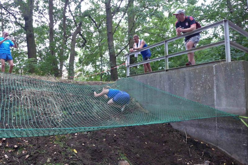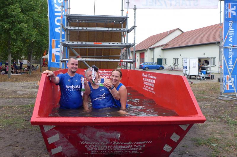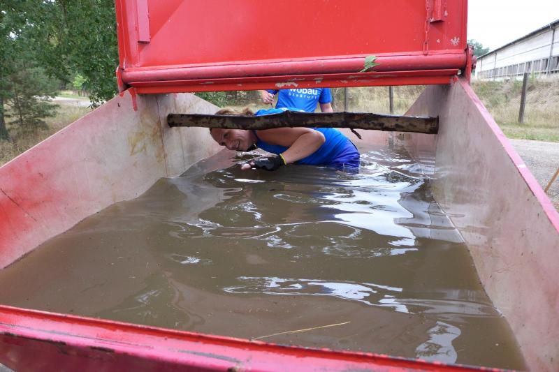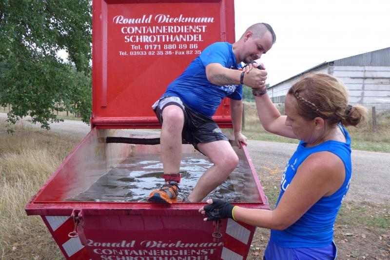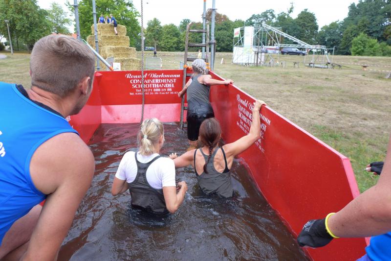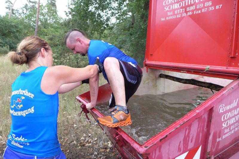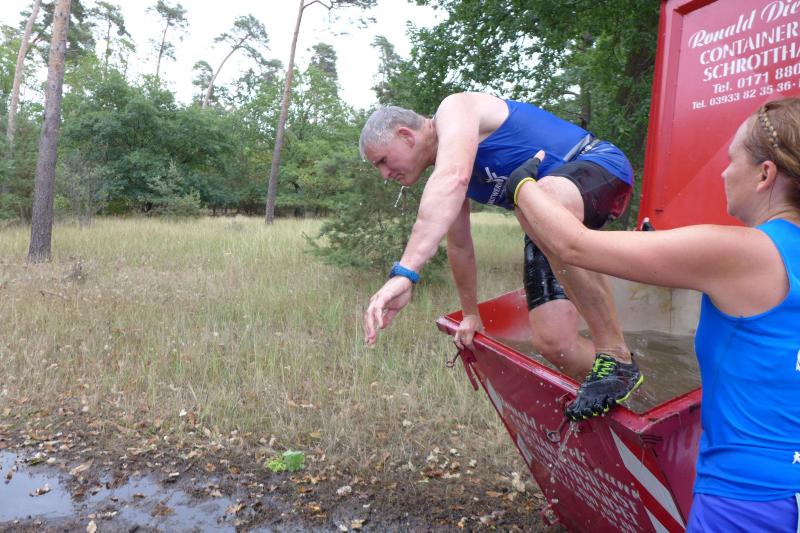 Bei der Genthiner Matschwolke waren auf jeden Fall ganze sieben Matschgänse auf einem Streich, oder besser geschrieben, in einem Team dabei. Die fünfte Auflage hatte ihren Start zum ersten Mal in Parchen. Hier sind die Bedingungen einfach noch besser, meint Mitorganisator Falk Heidel und filmte die Gaense, wie sie sich treppauf, treppab durch das altehrwürdige Parchener Schloss schoben. Mancher Streckenabschnitt war den Bode-Runners bereits vom Fiener Cross bekannt, doch da mussten sie nicht durch den hüfttiefen Mühlgraben oder zähen Morast waten, Fässer von A nach B transportieren oder auf einer Slag-Line balancieren. Die schnellsten Beine hatte man nach vorn beordert, was durchaus Sinn machte, belegten die ersten vier Matschgänse doch den zweiten Rang in der Teamwertung. Nach 30 verrückten Hindernissen und zwölf langen Kilometern, waren dann alle Bode-Runners wohlbehalten wieder im Ziel. Ein letzter Tauchgang, um sich eine der begehrten Finishermedaillen vom Grund des Containers zu fischen, gehörte inzwischen genauso zum Ritual, wie das strahlend weiße Handtuch für alle, die am Ende aus dem Dreckwasser auftauchten.