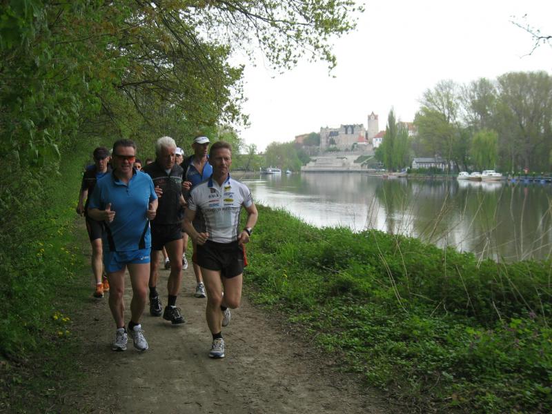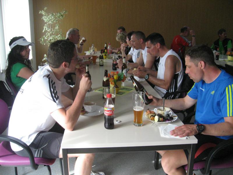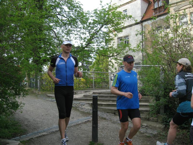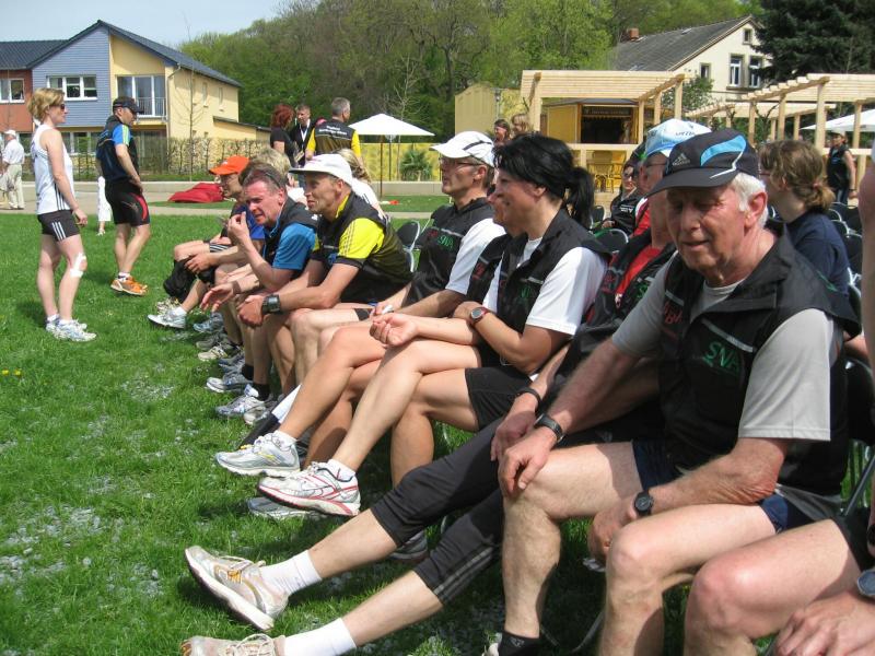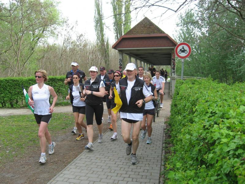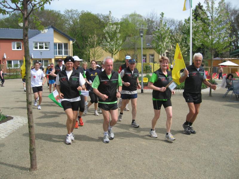 Nachdem sich zu früher Stunde bereits eine große Gruppe von Läufern der beteiligten Laufgruppen vor der Gaensefurther Schlossbrunnen Wüllner GmbH eingefunden hatte, verabschiedete deren Geschäftsführer Horst Braunisch die Teilnehmer, nicht aber ohne ihnen einen PKW voll mit erfrischendem Naß mit auf die Reise zu geben. Über die Roßbahn ging es dann zur 1. Etappe nach Staßfurt zu den Stadtwerken, wo die Läufer schon von OB René Zok und Betriebsangehörigen erwartet wurden. Die Übergabe der Staffelstäbe und die Einnahme einer kleinen Wegzehrung hingegen mussten zügig abgewickelt werden, hatte man doch durch einen Termin bei der LAGA in Aschersleben einen straffen Zeitplan vorgegeben. Wenn die Landesgartenschau für die älteste Stadt Sachsen-Anhalts das absolute Highlight des Jahres ist, warum nicht auch in den diesjährigen Stadtwerkelauf einbinden, dachten sich die Läufer von Ascania Aschersleben und sorgten damit für eine nette Bereicherung der Tagesplanes. Bei warmen, aber angenehmen Wind ging es weiter nach Bernburg, entlang der Bode und der Saale, deren Auen sich frühlingshaft geschmückt zeigten. Schon allein dieses Flair entschädigte für so manche Strapazen. In Bernburg bei den Stadtwerken angekommen, folgte dann der gewohnt herzliche Empfang mit Übergabe der Grußbotschaften, ergänzt durch einen leckeren Imbiß und weiter ging’s. An Verpflegung unterwegs mangelte es ebenfalls nicht. Die von Gaensefurther gesponserten Getränke und die Lunchpakete vom Speiseservice RiRo ließen diesbezüglich fast keinen Wunsch offen. Hatte trotz alledem ein Aktiver konditionelle Probleme, konnte er sich in einem der vier Begleitfahrzeuge erholen. 2 Sportler mussten leider ihren Plan, die gesamte Strecke durchzulaufen, nach 50 km aufgeben, denn das hohe Lauftempo forderte seinen Tribut. Bei dieser Eile übersah dann in den engen Promenaden von Aschersleben prompt ein Läufer einen Poller und es kam zu einer schmerzhaften Kollision. Aber zum Jammern blieb wenig Zeit, denn die Landesgartenschau wartete. Auf der Bühne im Weingarten war dann einige Prominenz versammelt und mittendrin unsere Helden mit den flinken Beinen, überwältigt vom folgenden Blitzlichtgewitter. Nachdem die eigentliche Mission des Laufes, die Übergabe einer Grußbotschaft auch an die Stadtwerke Aschersleben abgehandelt war, die die gute Zusammenarbeit auf kulturellem, wirtschaftlichen und natürlich sportlichem Gebiet dokumentieren soll, folgte die letzte Etappe der insgesamt 70 km langen Strecke.