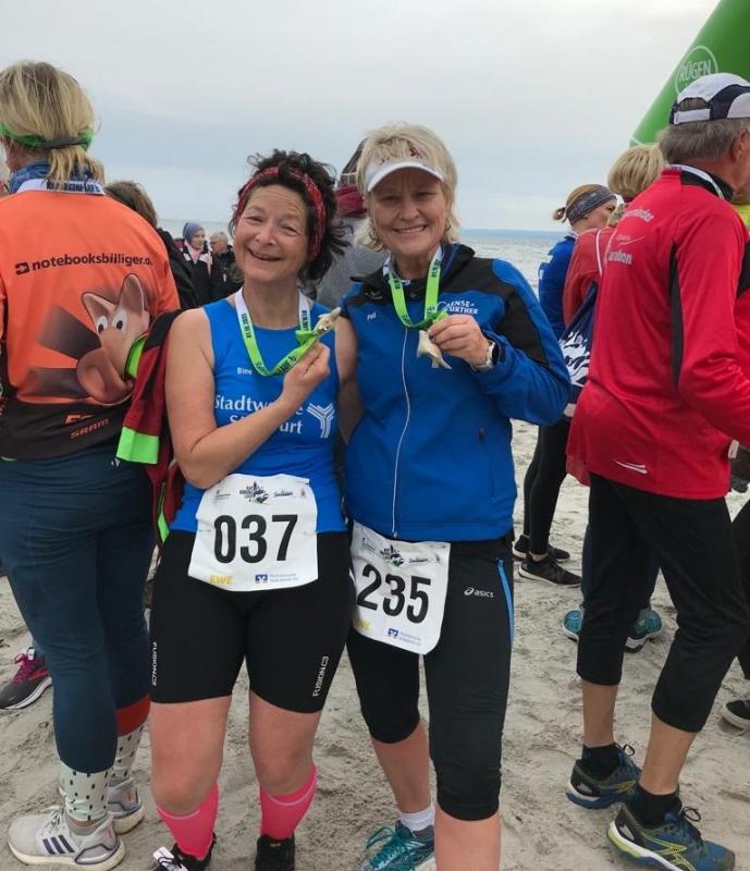 Punkt elf Uhr ging es dann für beide Strecken ans Eingemachte, denn die Halbmarathonis starteten am Zielbogen von Juliusruh in Richtung Arkona und die Zehn-Kilometer-Läufer liefen ihnen vom Kap aus entgegen. Schon bald begegneten sich die ersten Läufer, was die Stimmung auf der Strecke nur noch mehr pushte. Besonders emotional wurde es, wenn sich Bode-Runners trafen: "Jubi, Verena, Nancy, Olaf"!, klatschte Petra Becker ihre Vereinskameraden euphorisch ab. Becker, die zusammen mit Detlef Schäfer im vorderen Feld der Zehn-Kilometer-Läufer unterwegs war, hatte einen perfekten Lauftag erwischt, es passte einfach alles. Die Belohnung im Ziel ließ nicht lange auf sich warten, erliefen doch beide einen der begehrten Altersklassen-Pokale in Form eines Ankers, der im heimatlichen Hafen Unseburg sicher schon einen besonderen Platz eingenommen hat. Sabine Börner war zusammen mit Tochter Tina unterwegs. Als sie einige Minuten später als Becker die Ziellinie überliefen, zeigte die Ergebnisliste Platz vier in der Altersklasse W30 an: "So ein Pech!“, schmollten die beiden nach dem Zieleinlauf dann doch ein wenig: „Hätten wir geahnt, dass der dritte Platz nur 15 Sekunden vor uns läuft, hätten wir die Beine nochmal in die Hand genommen!"
