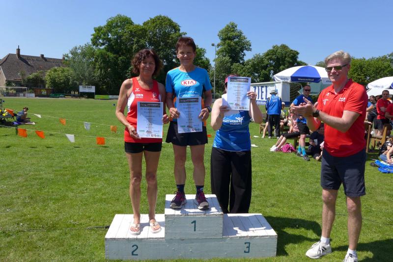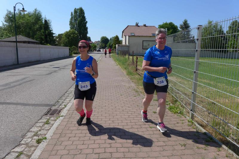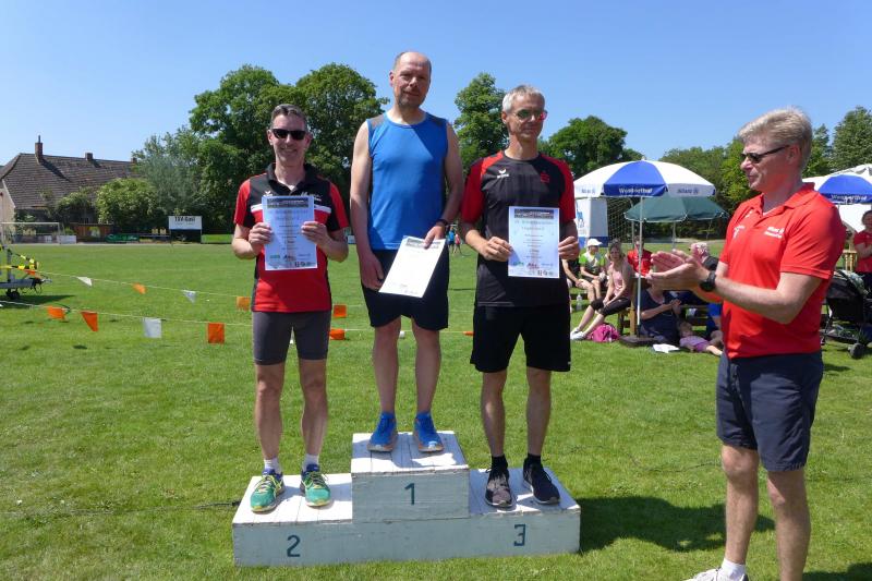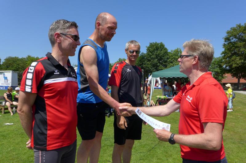 Die Startlinie auf dem Sportplatz füllte sich erneut, als dann die Wertungsläufe über sechs und zwölf Kilometer aufgerufen wurden. Vom weichen Sportplatzrasen ging es verwinkelt hinaus durch ein heißes Schackensleben, am stillgelegten Bahnhof vorbei in die weite Magdeburger Börde. Von wegen flach, der ersten Wasserstation ging eine Anhöhe voraus, die erst erlaufen werden musste. Frisch gestärkt ging es dann zunächst wieder hinab, bevor nach dem Stadiondurchlauf der Kurs erneut in Angriff genommen wurde. Hier kamen dem Gaensefurther Fotografen dann zum Glück noch einmal die Führungsläufer entgegen, die er diesmal beim Stadionstart verpasst hatte. Bis auf vier Bode-Runners, hatten alle anderen Lauffreunde auf Grund der Hitze oder aus taktischen Beweggründen in Sicht auf die Wertungspunkte, nur eine Runde durch die Börde absolviert. Jens Stampnik lief allen voraus, gefolgt von Sandra Homann und Neuzugang Jens Kunkel. So schnell unterwegs, wurden sie dann auch mit einem ersten Platz in ihren Altersklassen geehrt. Christa und Harald Fümel zogen die 6,3 Kilometer zusammen durch und liefen in ihren Einzelwertungen jeweils auf Platz drei. Ganz starke Damen waren in Schackensleben Kirsten Geist und Petra Becker, die sich an die zweite Runde trauten und am Ende mit Platz eins und drei für ihre Laufleistung belohnt wurden. Bis auf eine Ausnahme, hatten die Bode-Runners wieder einmal kein Losglück bei der abschließenden Tombola der Laufgruppe Hopfen Schackensleben. Nur Emily hatte an diesem Sonntag Fortuna auf ihrer Seite: „Ich habe die Startnummer 111!“, strahlte sie schon vor dem Start. Dann stand sie bei der Siegerehrung auf dem ersten Platz und gewann als einzige Gaensefurther Starterin ein hochwertiges Taschenmesser, über das sich der Papa am Ende freuen durfte. Eine Tüte Gummibärchen glich die Abgabe zum Glück wieder auf.