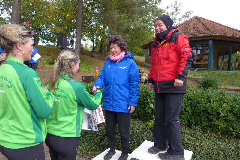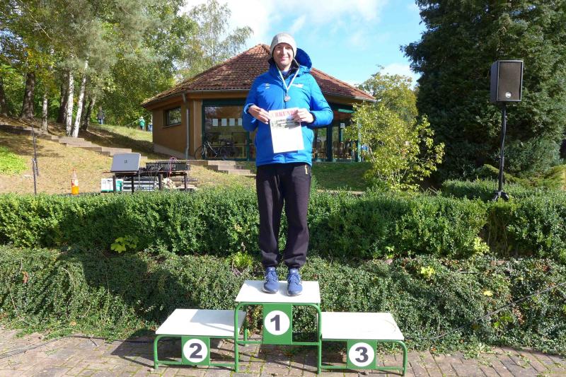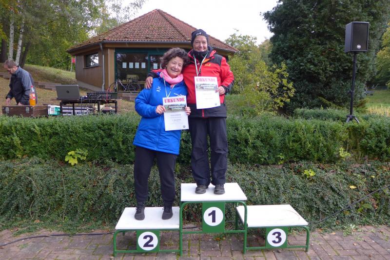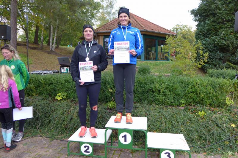 Bald folgten Jens und Nicole Schlottag, letztere als glückliche, zweite Frau Gesamt- und Altersklassensiegerin über die fünf Kilometerdistanz. Bis an die Ohren strahlte auch Herr Schlottag über seinen ersten Platz in der Wertungsklasse 50 bis 55 Jahre auf dem Podest: „Wie früher!“, freute er sich über seine Ehrung.