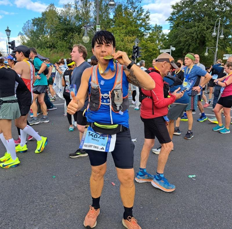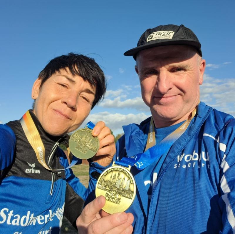 Und ein weiteres Rennen war an diesem Sonntag von großer Tragweite, hatten doch beim 50. Berlin Marathon 54.280 Finisher bei knackig kaltem aber sonnigen Wetter mal wieder Gänsehaut beim Durchlaufen des Brandenburger Tors. 50 Jahre Marathongeschichte, 50 Jahre Emotionen pur. Eine Veranstaltung die zu den größten Marathons der Welt zählt und bei der bereits 13 Weltrekorde erlaufen wurden. Im Jubiläumsjahr gab es keinen neuen Weltrekord, aber eine neue persönliche Bestzeit für Bode-Runner Rinaldo Schielke. Er hatte bereits am Start diese Gänsehaut und mochte seine Freudentränen nicht unterdrücken. Ein hartes Training ging Berlin voraus und nur eine kluge Renntaktik könnte vielleicht eine neue Bestzeiten zulassen, so der Plan. Von den vier großen Startwellen wurde Schielke kurz nach den Profis auf den 42,195 Kilometer langen Kurs geschickt. Ganze zehn Minuten dauerte es vom Startschuss bis zum Überqueren der Startlinie. So lief er bis zum Halbmarathonpunkt ziemlich entspannt mit dem Strom: „Es war einfach zu voll, um von Anfang an mein Tempo zu laufen. Da hätte man schon Slalom laufen müssen und das kostet zu viel Kraft!“, so Schielke, der nach seinen fünf absolvierten Marathons an Erfahrung gewonnen hat. Bis Kilometer 30 wurde das Tempo dann stetig gesteigert: „Es ging mir einfach super!“ So super, dass er für die letzten zehn Kilometer nur 43 Minuten brauchte und nochmal einige Plätze gut machen konnte. Doch die Platzierung spielte in diesem riesigen Starterfeld überhaupt keine Rolle: „Ich habe wirklich jeden Meter genossen und stand mit neuer Bestleistung in der Sonne Berlins!“, so ein überglücklicher Bode-Runner im Ziel. Auch Nancy und Olaf Bothe sowie Jens Schlottag gehörten an diesem Sonntag zu den Berlin-Runners. Allein die Möglichkeit, bei diesem Marathon am Start zu stehen, war schon ein großes Glück. Schnell waren die begehrten Startplätze ausgebucht und nur das Los oder die Warteliste entschied über eine Teilnahme. Schlottag ist süchtig nach Berlin und stand bereits zum elften Mal in einem Startblock. Dass er bei Kilometer 35 seine Frau als Streckenposten treffen würde, war neu auf seinem langen Weg durch die Hauptstadt. Nicole Schlottag war nämlich eine von über 6.000 Helfern an und um den Berlin Marathon. Schielke flog nur so an ihr vorbei, und Zeit, um vielleicht von den Bothes ein Foto zu machen, blieb auch nicht. Für den Ehemann hatte sie dann aber ein paar Sekunden, um ihm für die letzten Kilometer Motivation mit auf den Weg zu geben. „Es war eine fantastische Atmosphäre an der Strecke zum 50. Jubiläum!“, resümierte ein überglücklicher Schlottag im Ziel. Egal, auch wenn bei Olaf Bothe die Zeitmessung nicht funktionierte, so freute sich doch seine Frau Nancy über eine Verbesserung um sechs Minuten zu ihrem allerersten Marathon voriges Jahr, auch in Berlin.