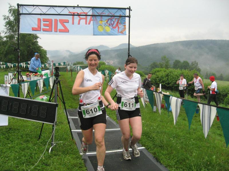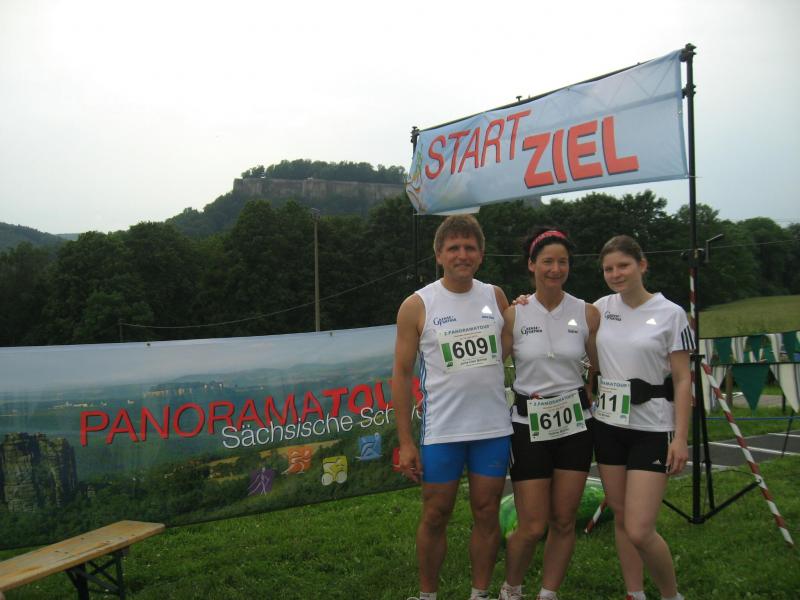 Die zweite Auflage des Panoramalaufs durch die Sächsische Schweiz, der am Sonntag durchgeführt wurde, nahmen Jens-Uwe und Sabine Börner (Gaensefurther Sportbewegung) sowie Tochter Tina (Hamburg) in Angriff. Bei idealem Wetter waren auf einer waldreichen 30 Kilometer langen Strecke entlang der Elbe 490 Höhenmeter zu überwinden. Jens-Uwe Börner (Altersklasse M 45/4.) benötigte dafür 2:33:52 Stunden. Gemeinsam ins Ziel liefen (v.l.) Sabine (Ak W 40/4.) und Tina (Ak W20/2.) nach 3:27:55 Stunden.
