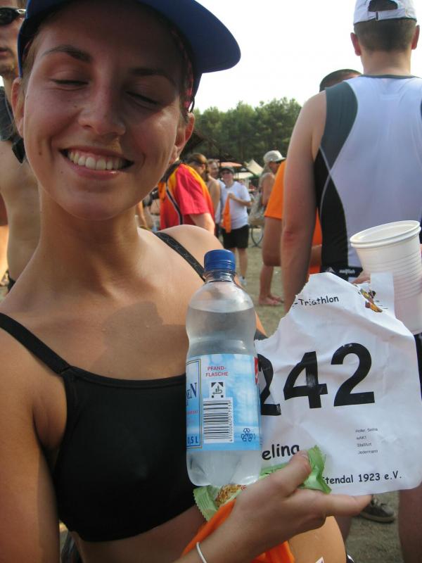 Ähnlich geschlossen verlief der Wettbewerb auch für Sabine und Jens-Uwe Börner, wenngleich die deutlich größeren Qualitäten der Dame einen beinahe zweiminütigen Vorsprung nach dem Schwimmen bescherten. Die Radstrecke indes "war so kurz, dass ich nicht mal meine Trinkflasche leer bekam", berichtete Sabine. Ein Kilometer auf der Laufstrecke musste vergehen, ehe sich ein bekanntes Stöhnen näherte. Einen Kilometer später begegneten sich die Eheleute aus Hecklingen sozusagen wieder auf Augenhöhe. Jens-Uwe zog also vorbei, musste an den Wasserständen wieder durchatmen, aber die Finisher-Handtücher im Ziel waren dann wichtig genug, um Sabine mit 19 Sekunden hinter sich zu lassen. Herr Börner belegte also in 1:18:37 Stunden den siebten Platz in der AK Senioren 2, Frau Börner wurde Zweite bei den Seniorinnen 1 in 1:18:56 Stunden. Aus Staßfurt nahm außerdem Stefan Masog teil, der den Wettbewerb in 1:24:56 Stunden absolvierte. Es gewann Jörg Knop aus Wolfsburg in 59:47 Minuten vor Peter Schwenzer (Einheit Rathenow/1:01:18 Stunden) und Franziska Tiex (USC Magdeburg/1:03:07).