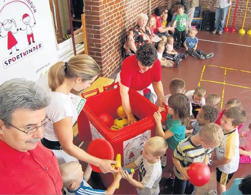 Ein großes Sportfest wurde gestern in der Hecklinger Turnhalle gefeiert. Gekrönt wurde es mit vielen aktiven Geschenken. Und die waren originell verpackt. Geliefert in einer roten Tonne fiel die Verpackung der sportlichen Auszeichnungen sofort ins Auge. Bevor der Deckel auf ging, legten sich die Mädchen und Jungen aber ihrem sportlichen Ruf entsprechend noch mal so richtig ins Zeug. Verschiedene Stationen waren zu durchlaufen. Dann wurde das Geheimnis um das leuchtende Fass gelüftet. Sportgeräte gingen weg wie warme Semmeln. Kita- Leiterin Kerstin Stüwe und Katja Bach von der Sportjugend Sachsen-Anhalt hatten alle Hände voll zu tun, die Bälle, Stelzen und Sprungtücher zu verteilen. Die Kita-Kinder, alles in allem besuchen rund 240 Mädchen und Jungen die Einrichtung, nahmen die Sachen sofort in Beschlag. Und das kommt den Initiatoren gerade recht. Denn die Kita wurde für ihr sportliches Engagement und die seit Jahren gepflegte Zusammenarbeit mit der Gaensefurther Sportbewegung ausgezeichnet.
