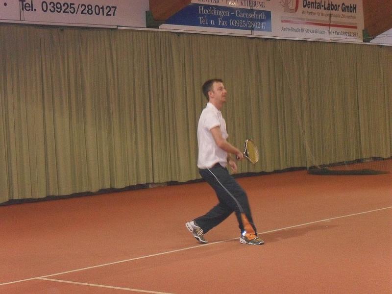 Im Vorfeld haben sich Doppelpartner gefunden, die über das gesamte Turnier gemeinsam antraten. Es spielten alle Doppel einmal gegeneinander, was insgesamt 21 Partien bedeutete, die jeweils nur über den langen Satz (Match-ende bei neun) ausgetragen wurden. Friedrich/Prüfer gaben keinen einzigen Satz ab und verließen den Court sechsmal als Sieger. Brian Dressler/Sebastian Haberecht (Grün Weiß Aschersleben) verbuchten fünf Siege, denn Friedrich/Prüfer ließen den beiden beim 9:4 keine Chance. Das spannendste Match lieferten sich Frank Müller/Ronny Selig und Manfred Rademann/Andreas Trensinger (alle Gaensefurth). Trensinger, der nach einer Verletzungspause wieder in den Spielbetrieb einstieg, legte mit seinem Partner einen Fehlstart hin. Das Duo lag schnell mit 2:7 zurück, drehte dann aber die Partie noch. Sie wehrten einen Matchball ab und siegten 9:8. Für Trensinger/Rademann bedeutete der Erfolg den dritten Platz.