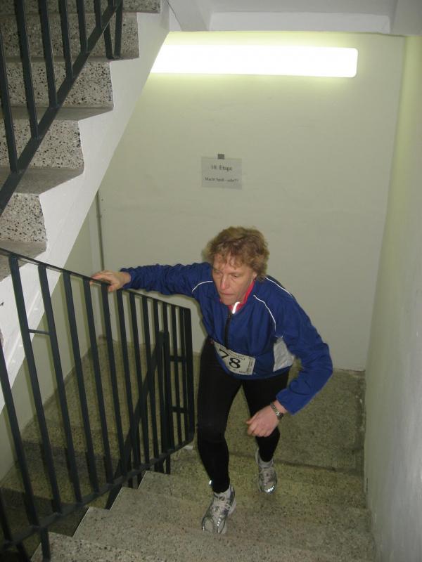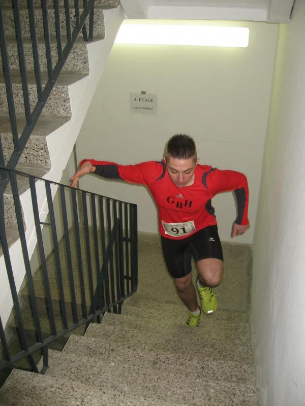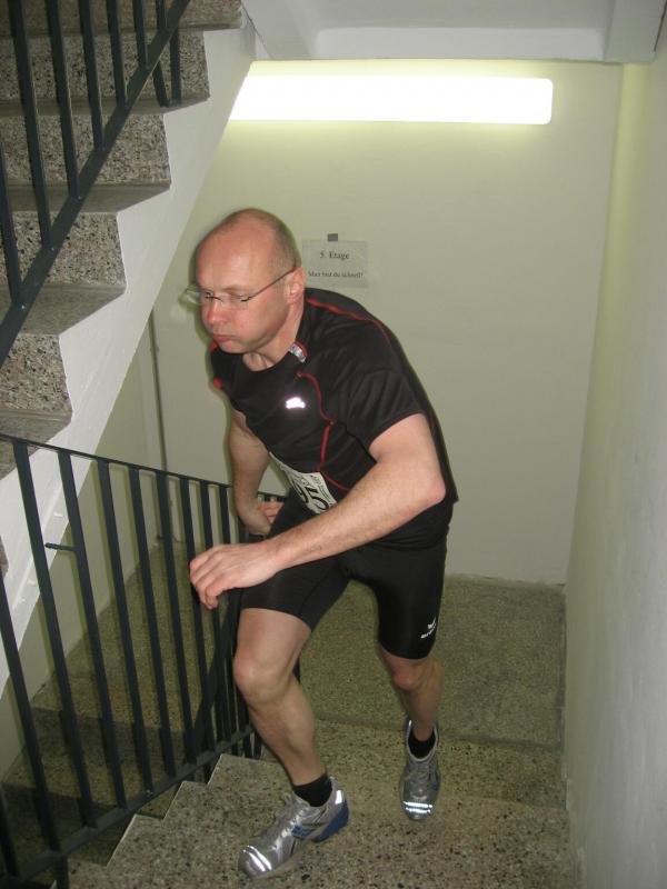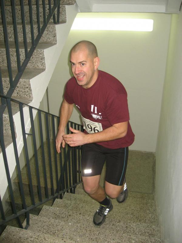 Routinier Jens-Uwe Börner, bereits das fünfte Mal dabei, sprintete als erster los. Nach 60 Metern Anlauf ging es über die ersten acht Stufen der Eingangstreppe in den Campus-Tower. Im Uhrzeigersinn folgte nun Etage um Etage. Ab dem zehnten Stockwerk war die Puste raus, elf, zwölf, dreizehn. Wo war hier eigentlich Schluss? 14. Etage, die Tür zum Treppenflur ist geöffnet, raus! „Wo ist denn hier das Ziel?“ haucht Börner einen Passanten an. „Na oben!“ zeigt der verblüffte Gefragte mit gestreckter Hand. Nein, welch ein Zeitverlust! Noch mal den Tritt aufnehmen, noch ein Geschoss und dort wartete auch schon die Zielkamera, wie immer in der 15. Etage. Keine Zeit für die Sanitäter oder ein Schluck Wasser, Börner nahm mit eiligen Schritt den Fahrstuhl nach unten um die Sportkollegen zu warnen: „Ihr müsst bis ganz oben durchlaufen, ich hab mich verlaufen!“ Spätestens jetzt waren die Debütanten Thomas Vetter und Olaf Moch richtig aufgeregt. Alle 30 Sekunden ging dann einer nach dem anderen auf den Höllentrip. Schnellster Staßfurter sollte Florian Börner werden, gefolgt von Johannes Höber, welcher in der Altersklasse bis 18 Jahre damit einen zweiten Platz landete. Die beiden Neuzugänge der Abteilung Triathlon machten richtig Speed und hatten am Ende ihren Spaß. „Das war ein Erlebnis!“ zogen sie zufrieden Resümee. Bei den Frauen belegte Sabine Börner in der Altersklasse ab 35 Jahre den ersten Platz, hinter ihr Andrea Krukowski auf Platz zwei. Auch in diesem Jahr wurde der Streckenrekord aus dem Jahr 2002 nicht geknackt: In 57,8 Sekunden bis in die 15. Etage - Wahnsinn!