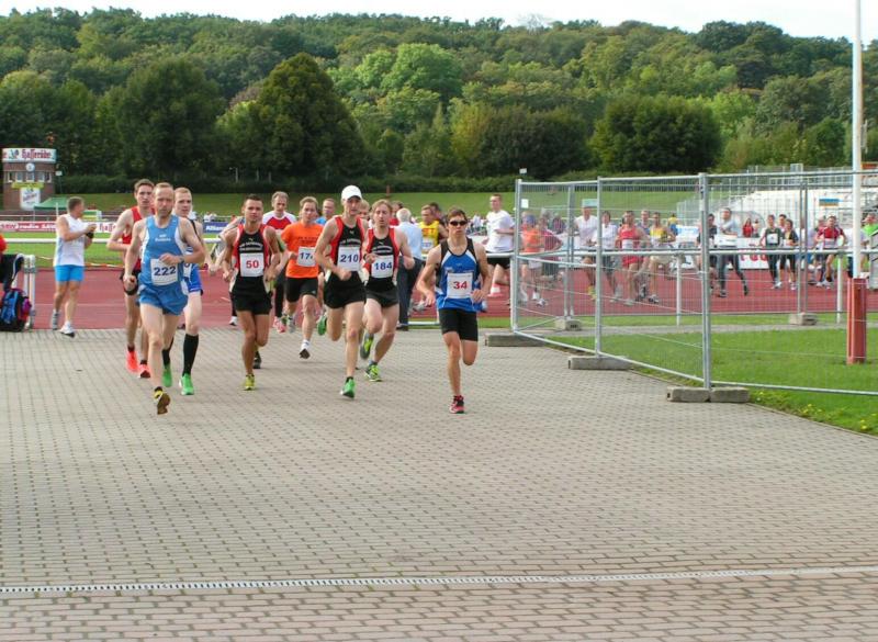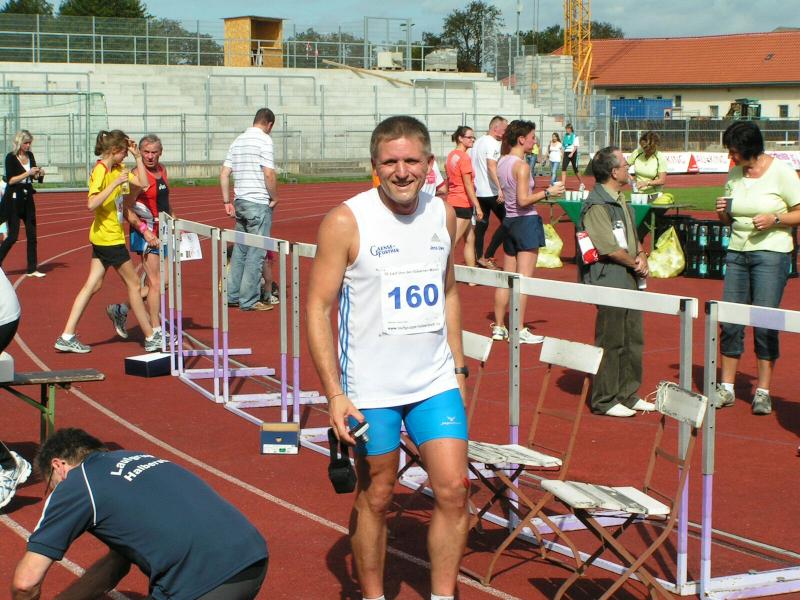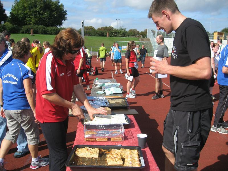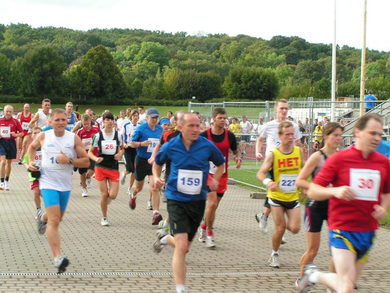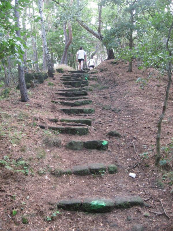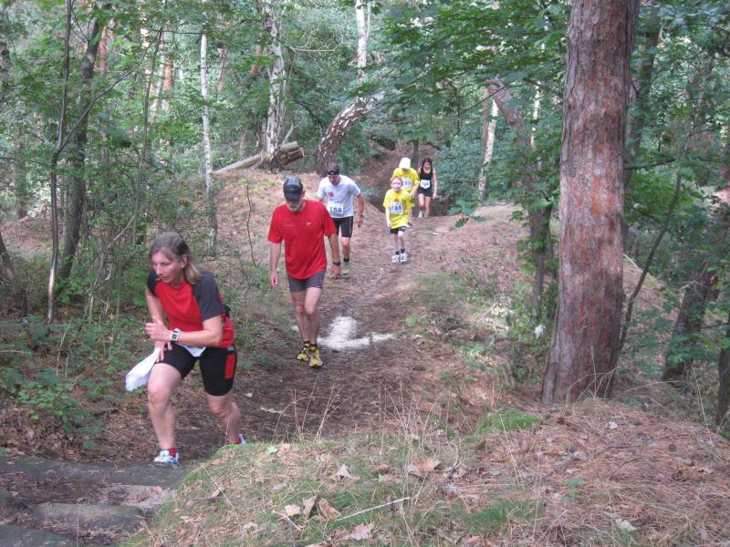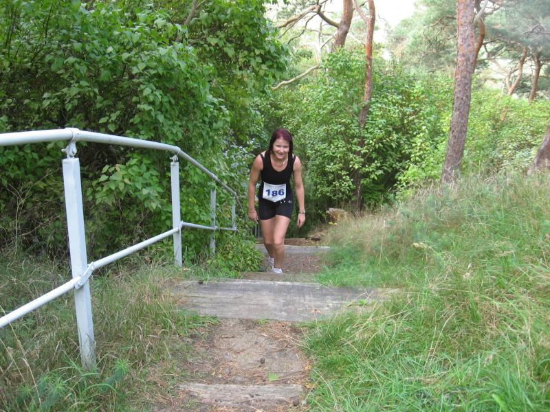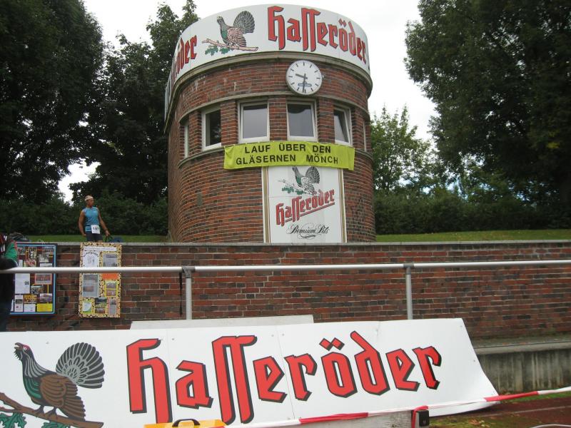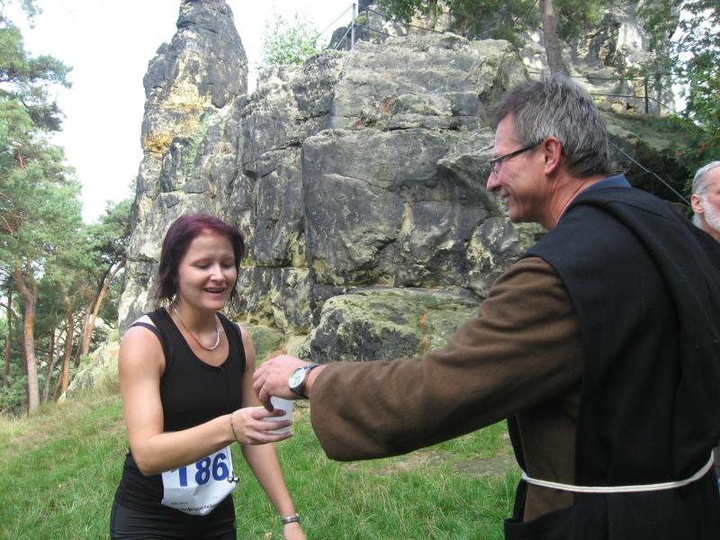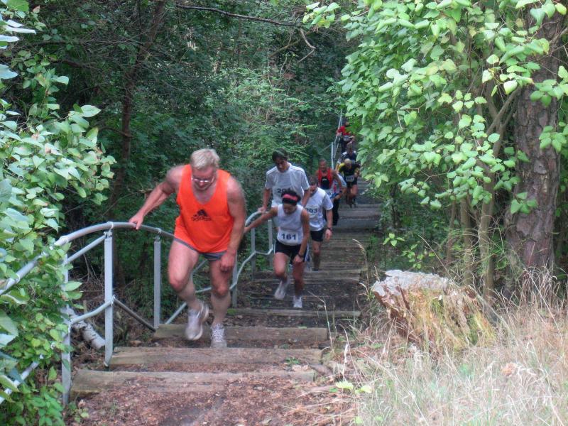 Spätestens mit dem Startschuss über 13 Kilometer waren die Gedanken an den bevorstehenden Muskelkater verschwunden und langsam reihte man sich im Tross der Laufverrückten ein. Die ersten sechs Kilometer verliefen in leichten Wellen, bevor die berüchtigte Treppe hinauf zum Gläsernen Mönch den Lauf abrupt stoppte. Quasi im Gänsemarsch zog sich die Menschenkette pustend die 230 Stufen hinauf, bis ein Mann im Mönchsgewand mit kühlem Nass und Bibel das Ende der Qual erahnen ließ. „Bitte lieber Gott, heile mich von dieser Laufkrankheit!“, konnte man vielen Gesichtern scheinbar entnehmen. Aber weit ab vom Start ging der Weg nur weiter und das zum Glück dann auch bald wieder bergab. Unaufmerksam und wie immer der Fotografie verfallen, stürzte Jens-Uwe Börner über eine Wurzel und konnte nun eine Wunde am Knie sein eigen nennen. Zu diesem Zeitpunkt gab er dann auch Schmidtschneiders Verfolgung auf, widmete sich ganz seinem Hobby und hakte den Lauf als gute Trainingsvorbereitung für den Magdeburg-Marathon ab.