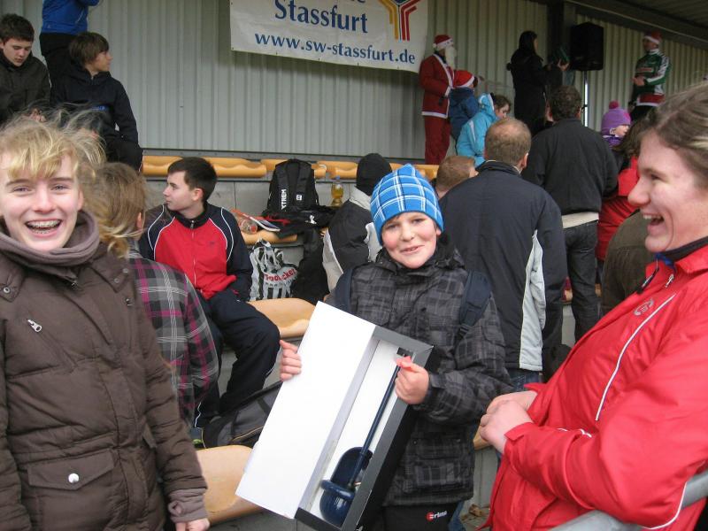 Nun ertönte lautes Gebimmel als Aufruf zum 30- und 60-Minuten-Lauf. Im passenden Nikolaus-Laufdress oder ganz normalen Laufklamotten, lauschten die 39 Paare der Einweisung. Das extra für die Rundenerfassung ausgedachte System stand vor seinem ersten Härtetest. Wurde der Staffelstab korrekt an das Zählgerät gehalten, war die Runde registriert. Nach 30 Minuten endete für die elf bis 13-jährigen der Lauf. Nun hieß es auf die Außenbahn zu treten und auf das Ausmessen zu warten. Das Ergebnis stand bald fest: die Gaensefurther Lea Wienert und Nico Ringström hatten ebenso wie die Staßfurter Eva Höber und Celina Müller in ihren Wertungsklassen die Nase vorn. Im Stundenlauf der Männergruppe bis 39 Jahre kämpften indes Benjamin Langer und Felix Roge aus Magdeburg gegen Torsten Blauwitz und Stephan Härtel als Gaensefurther Team. Bis zur letzten Runde lagen sie gleichauf, bei Langer und Roge ermittelte das Rollrad ein paar Meter mehr. Ebenso rundenstark, nur in der Altersklasse ab 40 Jahre startend, eilten die Hecklinger Rüdiger Nettlau und Sebastian Schrader um den Sportplatz. Ein souveräner erster Platz war ihnen sicher, gefolgt von den Staßfurter Triathleten Ralf Rosenmeier und Toralf Schmidtschneider auf Platz zwei. Fast konkurrenzlos liefen die Staßfurter Damen Lia und Selina Hofer auf den zweiten Rang. Mehr Teilnehmer starteten in den Mix-Teams ab 40 Jahre. Ganz knapp ging der zweite Platz an Katrin-Winkler-Hindricks und Uwe Langer vom Gaensefurther Team, gefolgt von Heidi Schwenke mit Sivilo Kelle vom BSV Eickendorf. Im Sound der flotten Musik und immer motiviert vom feschen Stadionsprecher, freuten sich Jenny Kluge und Martin Neumann vom Staßfurter Gymnasium in der Klasse Mix bis 39 Jahre, über den zweiten Platz.