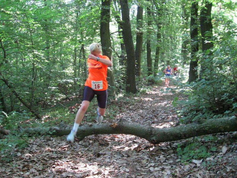 Als anspruchsvoll und für „Fortgeschrittene“ deklariert, sollte die Strecke ihrer Beschreibung durchaus gerecht werden. Bereits nach dem ersten Kilometer stieg die Asphaltstraße merklich an. Doch gerade als das Atmen zu anstrengend werden sollte, sorgte ein schattiger Waldweg wieder für Entspannung. Das Spiel zwischen Licht und Schatten erforderte die ganze Aufmerksamkeit der Läufer. Hatten die Veranstalter den quer liegenden Baum als Extra-Bonbon auf dem Weg drapiert? Wie bei der „stillen Post“ wurde vom Vordermann lauthals an den Verfolger weitergegeben: „Baum!“ Gehüpft, gegrätscht oder draufgetreten, die Barriere sollte für die Läufer kein Hindernis sein. Aus dem Wäldchen führte die Strecke hinaus auf die Felder. Bis zur Streckenteilung brannte die Sonne zusätzlich auf die erhitzten Köpfe. Streckenposten teilten nun die ankommenden Läufer auf: „Die Sieben Kilometer nach links, elf Kilometer nach rechts!“ „Machs gut, arme Bine“, verabschiedete sich Petra Becker von ihrer Vereinskollegin. Zusammen mit Heidi Schwenke vom BSV Eickendorf flitzte Becker nun in Richtung Konradsburg. Die Wahl der kürzeren Streckenlänge sollte sich am Ende gelohnt haben, denn beide Läuferinnen konnten in ihren Altersklassen auf das Siegertreppchen steigen.