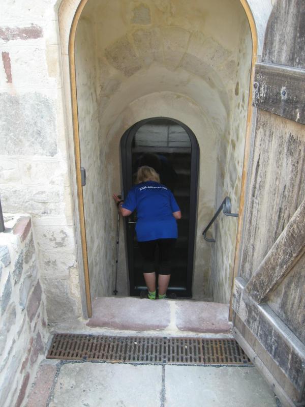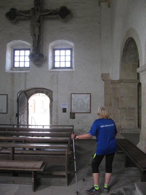 Jens-Uwe Börner, mit den 11-Kilometer-Läufern unterwegs, erspähte mit seinem Fotoapparat am Horizont den Brocken. Spätestens hier kam wohl der Entschluss mehr auf die Bildmotive als auf die Laufzeit zu achten. Die Läufer erreichten über den Friedrichshohenberg den höchsten Punkt der Strecke und bogen nun ebenfalls in Richtung Konradsburg ab. Während sich einige Walker und natürlich auch Herr Börner Zeit für eine kurze Besichtigung nahmen, eilten die Läufer durch den kleinen Burggarten wieder hinab nach Ermsleben.
