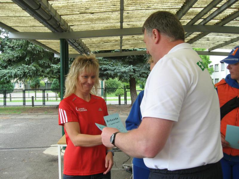 Sogar auf der langen Distanz kämpfte man erfolgreich. Nach langer Verletzungspause wieder auf dem Weg nach vorn, verpasste Detlef Schäfer den dritten Platz in der Gesamtwertung über 13,3 Kilometer nur knapp. In seiner Altersklasse bedeutete dies aber Platz eins, Jens-Uwe Börner schaffte es auf den dritten Platz. Wenn schon bis Tangerhütte, dann auch der lange Lauf, dachten sich Petra Becker und Sabine Börner bei der Anmeldung. Belohnt wurden sie dafür mit herrlichen Waldwegen und intensivem Kiefernduft. Noch größer war die Freude, als man der duschenden Petra zurief: „Mach hin, du musst zur Siegerehrung!“ Platz drei für Petra Becker in der stark vertretenen Altersklasse der 40-Jährigen! Ein schöner Zug des Veranstalters war, dass sogar alle Teilnehmer eine Urkunde mit Platz und Ergebnis entgegennehmen konnten. So bekam schließlich auch noch Sabine Börner eine Urkunde für den vierten Platz.