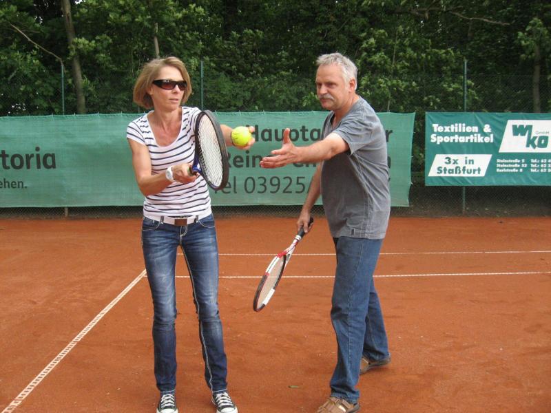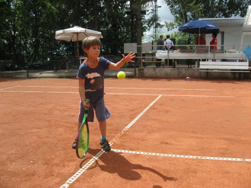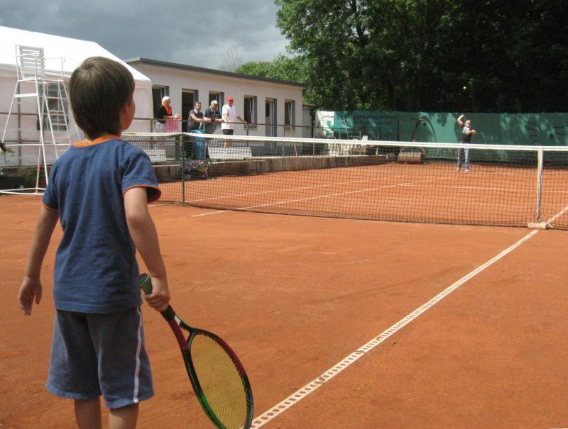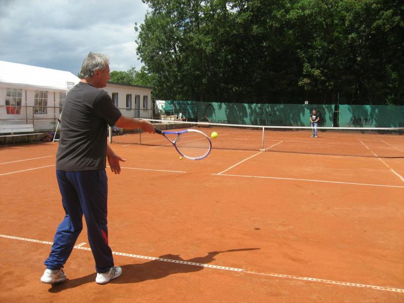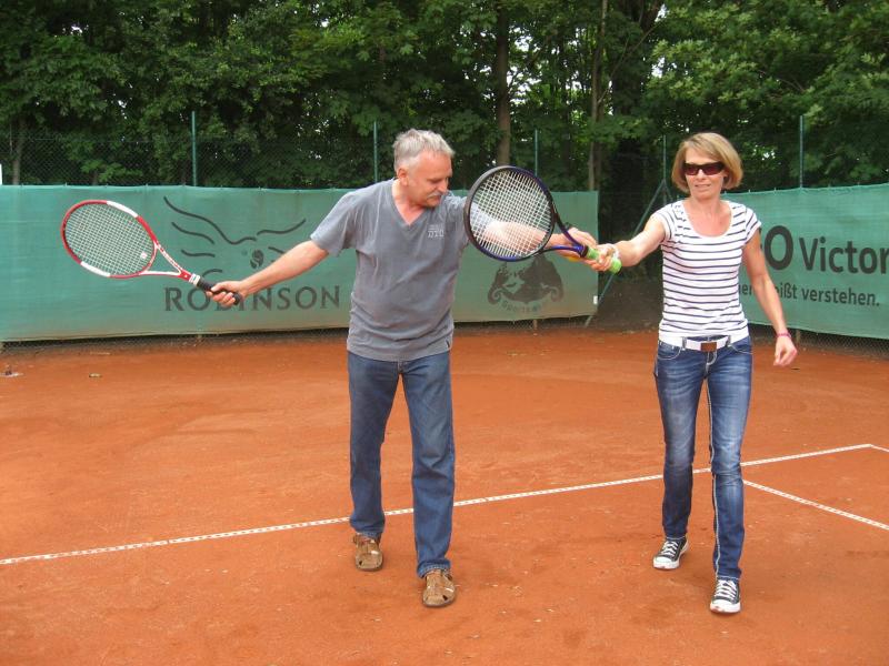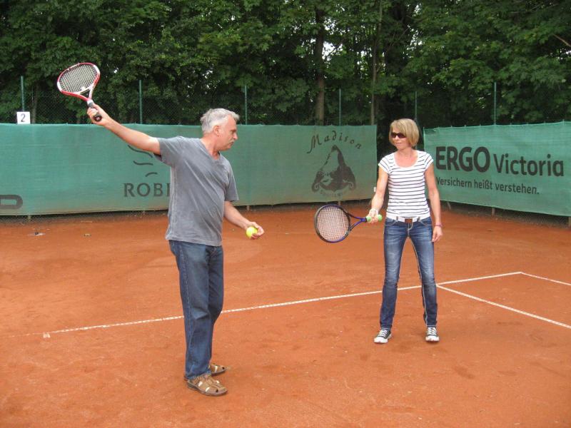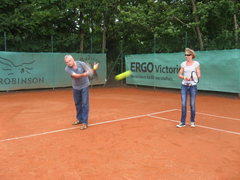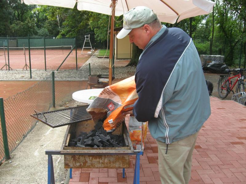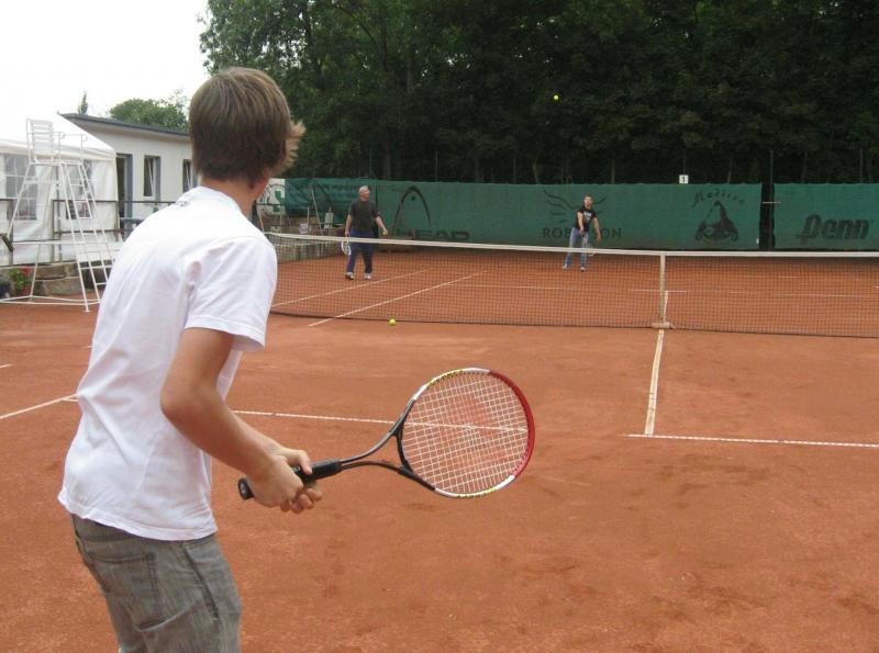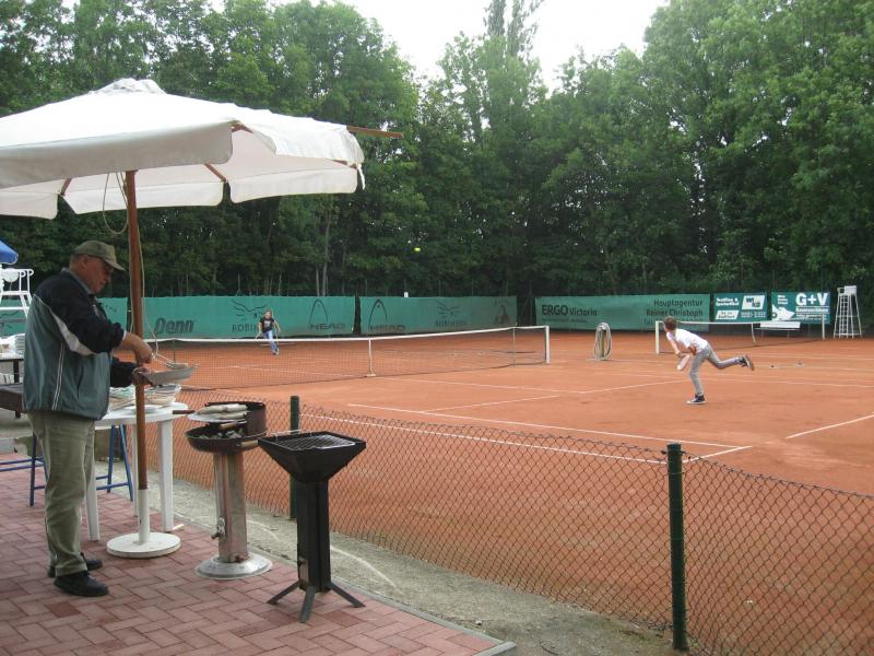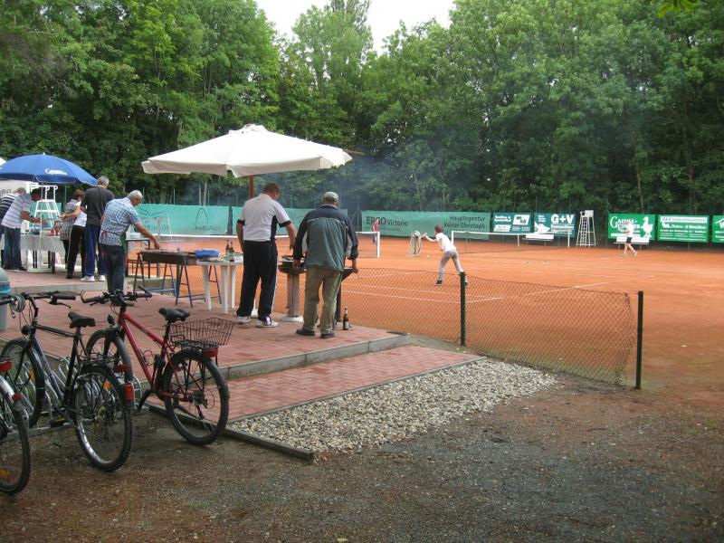 Hoch interessiert und motiviert fanden sich also Läufer und Triathleten auf den vier neu rekonstruierten Tennisplätzen ein. Vorerst bestaunte man die ebenfalls frisch sanierten Vereinsräume, waren doch die Plätze aufgrund heftiger Regenfälle noch mit großen Pfützen gespickt. Fleißige Tennisspieler waren aber bereits dabei, mit Riesenbesen die Plätze wieder bespielbar zu machen. Die Grills arbeiten dann auch bald auf Hochtouren und die Bierchen und lecker mitgebrachten Salate stimmten wohl sogar den Wettergott gnädig. Unter kompetenten Anleitungen wurde nun dem einen oder anderen Runner wohl zum ersten Mal Vor- und Rückhand erklärt. Nach ersten Aufschlagübungen und nahen Netzschlägen der Anfänger, lieferten sich Alleskönner und Profils bereits ordentliche Schmetterbälle, gekonnte Passierschläge oder Stoppbälle. Bis zum Abend hielt das rege Treiben auf den Plätzen an.