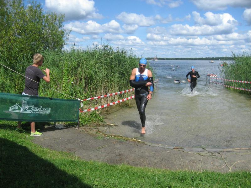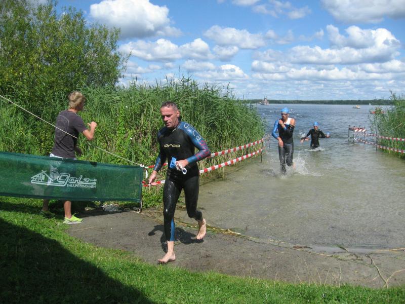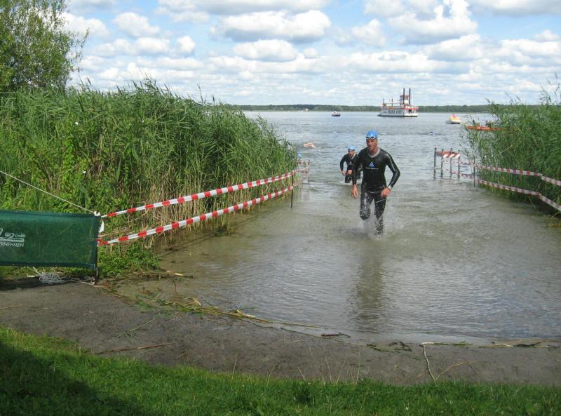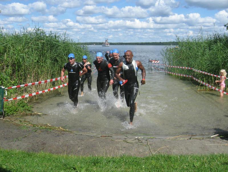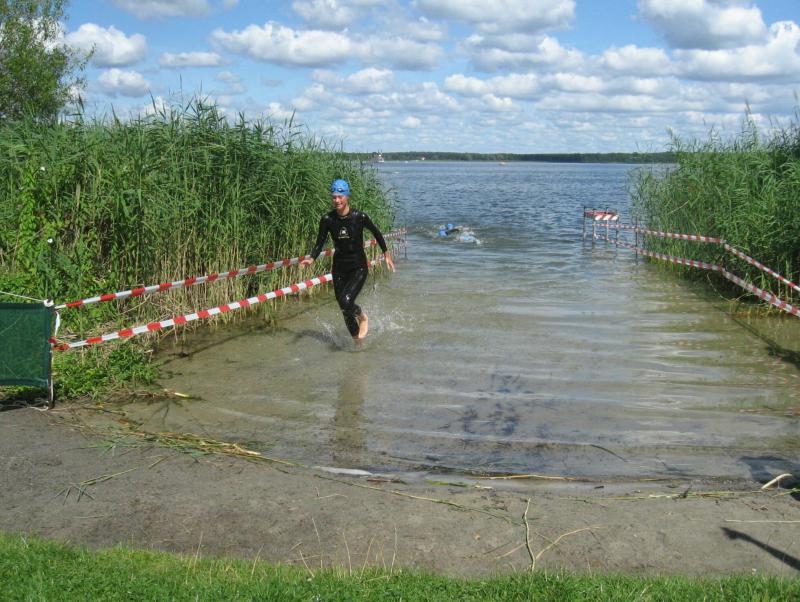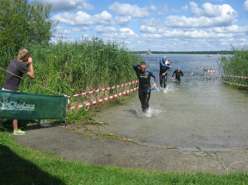 Nachdem der altehrwürdige Schaufelraddampfer "Queen Mary" die 110 Starter, darunter acht Gaensefurther, zum "fliegenden Start" ins Wasser befördert hatte, ging es schnurgerade wieder auf den Strand zu. Erstmals in Arendsee übrigens nicht mit motorisierter Begleitung, da sich einige Athleten in den Vorjahren über die Abgase des Begleitbootes beschwerten. "Vorneweg paddelte diesmal ein Drachenboot. Das war eine schöne Orientierung." Am dichtesten hinter der Zehn-Mann-Besatzung schwamm von den Gaensefurthern Abteilungsleiter Steffen Schöler, der nach 31:09 Minuten die Wechselzone erreichte.