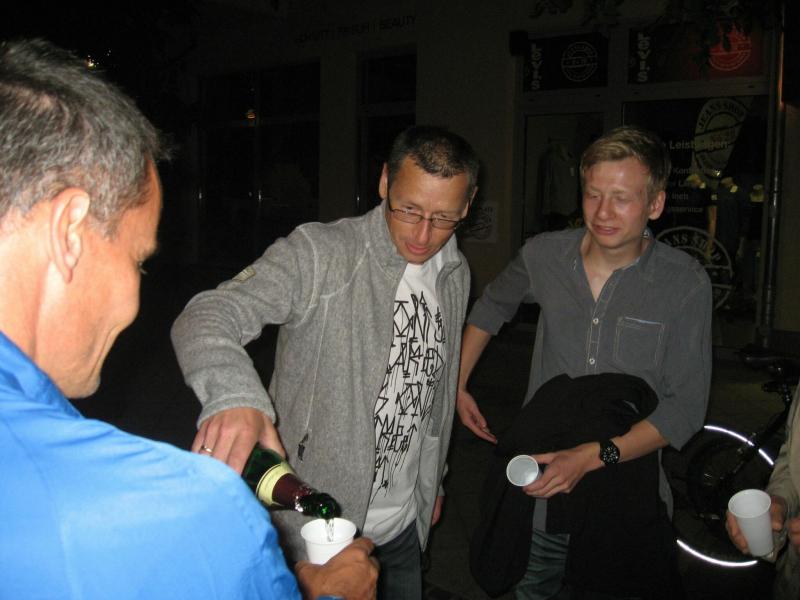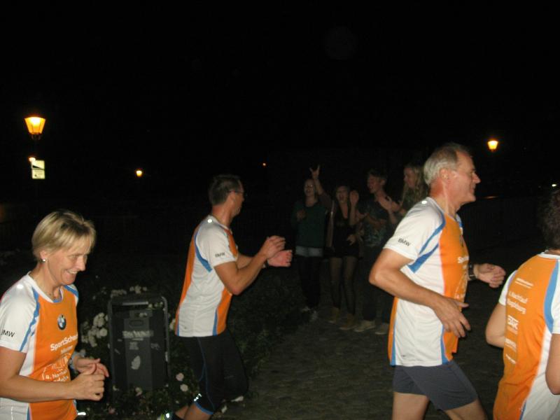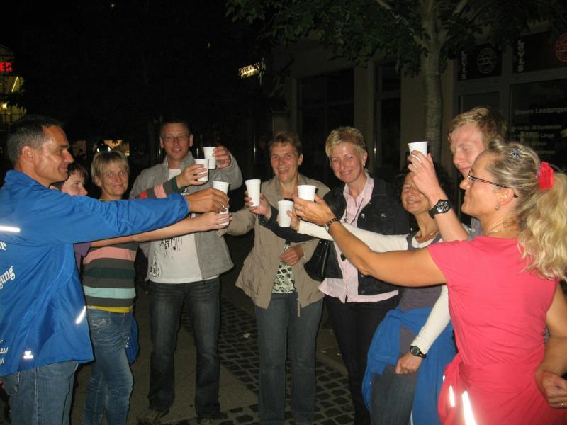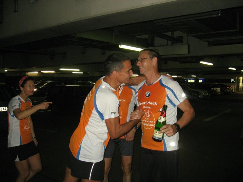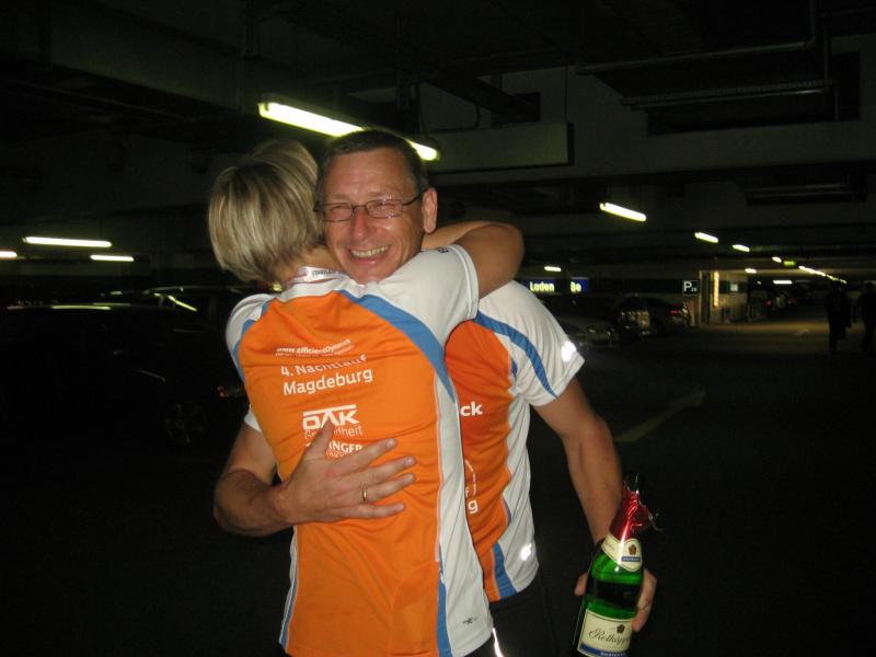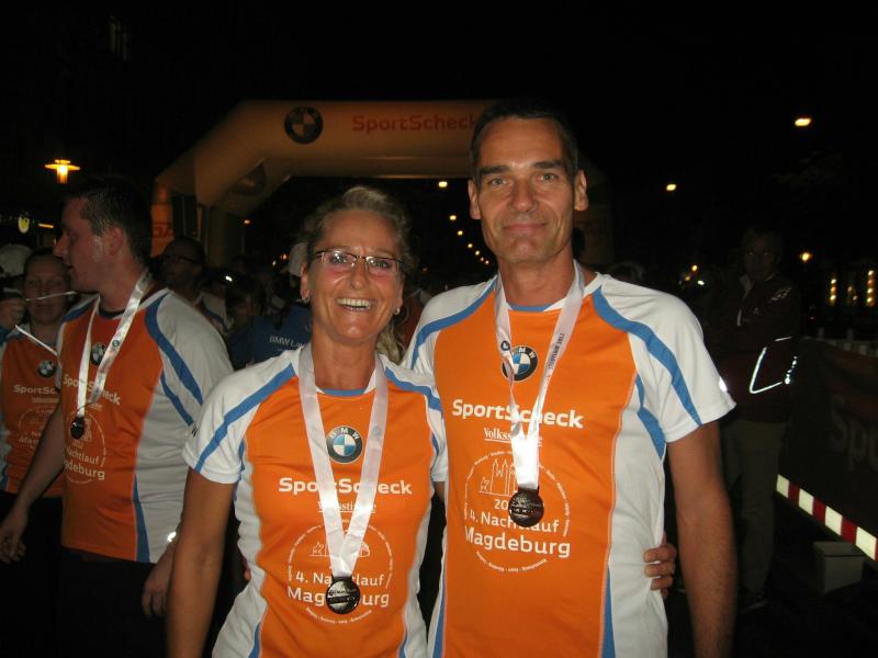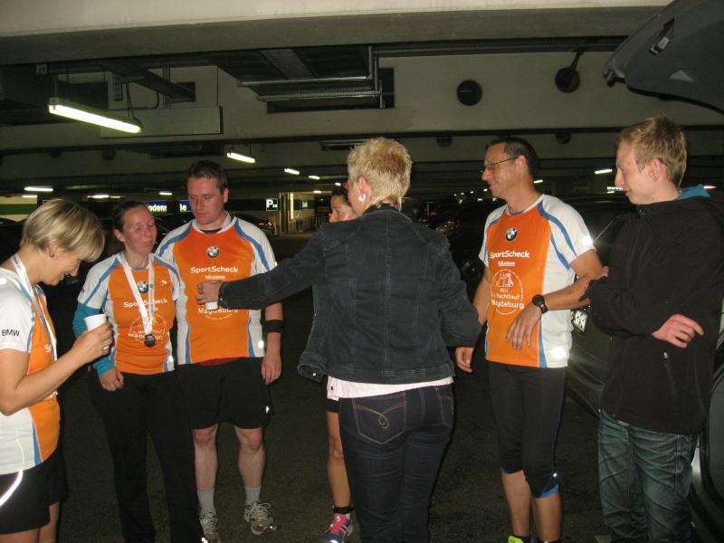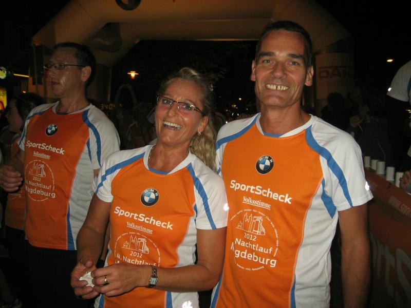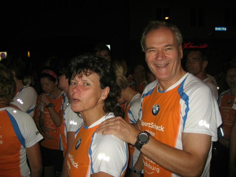 Und der Magdeburger SportSchecklauf war wirklich ein großes Event. Die Aufregung, aber auch die Freude, dass es nun endlich los gehen kann, konnte Claudia nicht verbergen. Verstärkt wurde die Anspannung nicht nur durch die 16 mitgereisten Lauffreunde, sondern auch durch die übrigen rund 3.000 Läufer, welche sich in orangenen Laufshirts bis kurz vor dem Start unter die bummelnden Freitagabend-Einkäufer mischten. Magdeburgs City war abgesperrt, die Läufer über die Fünf-Kilometerdistanz standen hinter dem Startbogen und Claudia Meier stand mittendrin. Nach Gruppenfoto und den üblichen guten Wünschen für den Lauf, hatte sich die Truppe im hinteren Feld einsortiert. Man wollte versuchen zusammen zu laufen, soweit das bei den Massen überhaupt möglich sein sollte. Fast zwei Minuten vergingen nach dem Startschuss, bis alle Bode-Runners die Startlinie überquert hatten. Nun lief auch Claudias Zeit. Über die breite Strombrücke verteilte sich das Läuferfeld recht zügig und erste weite Ausblicke auf die bunt beleuchtete Magdeburger Elb-Kulisse sorgten für Gänsehaut. Während Lauffreunde Anfangs mit gutgemeinten Sprüchen die Situation entspannen wollten, beruhigte Dirk mit Blick auf die Stoppuhr: „Genau dein Tempo!“ Aufgereihte Fackeln beleuchteten das dunkle Elbufer. Beeindruckt schob sich das Läuferfeld durch die Nacht, inzwischen war es 21.00 Uhr. Von weitem vernahm man bereits Trommler, welche die Läufer am Ende der Sternbrücke im Takt begleiteten. Durch die neu gestalteten Elbterrassen verschwanden die Sportler dann teilweise im Schatten des gigantischen Domgemäuers. Vorbei am Hundertwasserhaus war bereits der Startbogen zu erkennen. Während man im großen Feld die Lauffreunde für den Zieleinlauf ortete, kam das Gefühl, ´Schade, schon vorbei´. Claudia gab alles und auf den letzten 100 Metern sogar einen Sprint. So einige Bode-Runners hatten Mühe ihr zu folgen. Ja, auch das hatten sie trainiert! „Ach, hätten ruhig sechs Kilometer sein können!“, grinste sie bis an die Ohren und stellte sich mit Dirk noch einmal den Fotografen. Ausbaufähig, waren sich alle Bode-Runners der Gaensefurther Sportbewegung einig! Claudi, wir bräuchten da noch einen Staffelläufer für den Frankfurt Marathon…