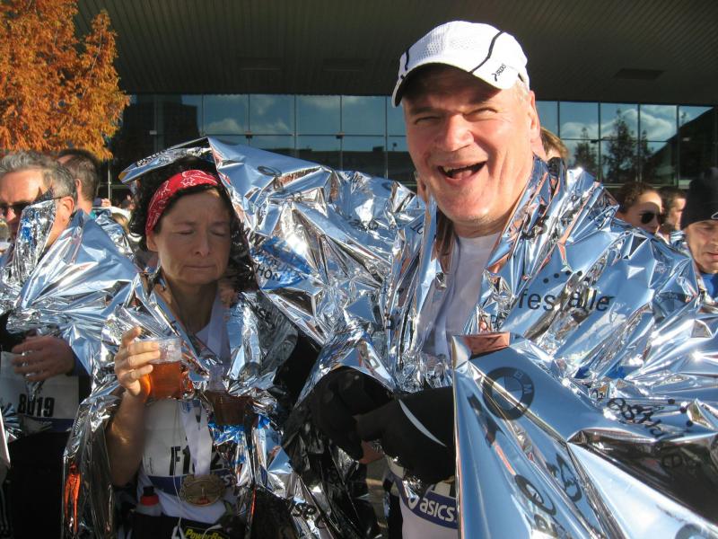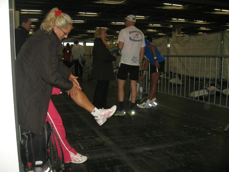 Nein, krank sind sie noch nicht! In Plastiktüten gegen die Kälte gehüllt, bibbern sie ihrem Start entgegen. Jörg Schäper, Lutz Klauß und Sabine Börner zählen in der nächsten Welle von 10 rückwärts: 9, 8, 7 … 1 – Start! Noch mehr Gänsehaut, denn nun setzten sich weitere 5.000 Läufer in Bewegung. Tolle Erfindung diese Wellenmethode! Von Anfang an haben die Sportler ausreichend Platz. Nach dem ersten Kilometer ein kritischer Blick auf die Stoppuhr – und Erleichterung, genau im Zeitplan. „Jetzt können wir endlich laufen, jetzt ist alles gut!“ Es läuft gut, zu gut, Runner`s High, ein euphorisches Hochgefühl welches die Beine immer schneller werden lässt. Mit einer irren Durchgangszeit von 01:39 Stunden passieren Meier und Börner die Halbmarathondistanz. Zeit Meier ziehen zu lassen, das Foto hatte Börner bereits im Kasten. Bei Schäper lief auch alles super, Klauß und Sabine Börner waren noch bis Kilometer elf zusammen. „Lauf dein Ding!“ schickt Sabine ihn auf die Reise „Ich schalte einen Gang runter!“ Bald überholt auch Schäper. Gut gelaunt und locker verschwindet er bis zur nächsten Verpflegungsstelle im Läufermeer. Sabine braucht keine Verpflegungsstelle. Vollgehängt mit Trinkflaschen wird beim Laufen getrunken. Reine Kopfsache, den Rhythmus nicht unterbrechen, vier Stunden durchlaufen bis zum Ziel! Während dessen hat sich Börner von den ersten 25 Kilometern langsam wieder erholt. Ob die Staffelläufer zu sehen sind? Renate Liedtke als Startläufer wurde mit der letzten Welle auf die Reise geschickt. Nach 12 Kilometern übergab sie ihren Chip an Claudia Meier, welche für sieben Kilometer die Staßfurter Läufer vertrat. Rein in den Wechselgarten und Übergabe an Sylvia Köhn. Sie muss sich die Kräfte genau einteilen, denn auf Grund des Ausfalls eines Läufers wird sie zwei Etappen bewältigen müssen. Kein Problem für Köhn, hat sie doch die fehlenden 23 Kilometer in letzter Zeit bereits öfters absolviert.