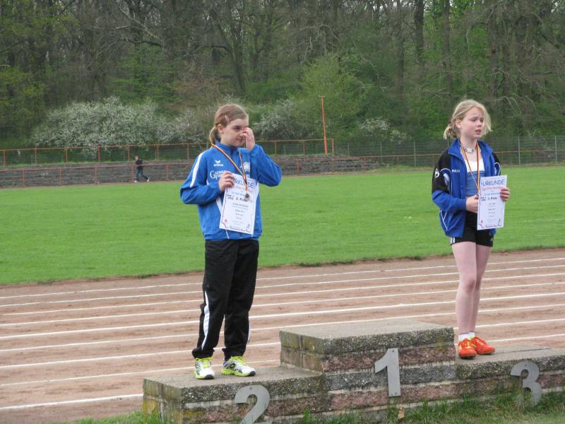 Wieder mit dabei unsere jüngsten Wettkämpferinnen in der Altersklasse w7 Nina Ritter und Fabienne Sämisch. Hoch motiviert begannen beide mit dem Schlagballweitwurf. Es lief dann auch ausgezeichnet, denn sie verbesserten ihre persönlichen Bestweiten enorm. Nina beherrschte die Konkurrenz klar und wurde mit 16,11 Metern Siegerin. Bei Fabienne landete der Ball unglaubliche 5 Meter weiter als sonst bei 14,38 Metern. Dafür wurde sie mit Platz drei belohnt. Im 50m Lauf verbesserte Nina erneut ihre Rekordzeit und kam mit 9,66 Sekunden auf den 3. Podestplatz. In dieser Disziplin konnte Fabienne in der laufenden Saison hingegen noch nicht an ihre alte Leistung anknüpfen und es sprang mit 9,99 Sekunden im Vorlauf und 10,11s im Endlauf Rang sieben heraus. Einen Platz im Mittelfeld beim Weitsprung gab es für Nina (9.) mit 2,43 Meter und für Fabienne (13.) mit 2,28 Meter.
