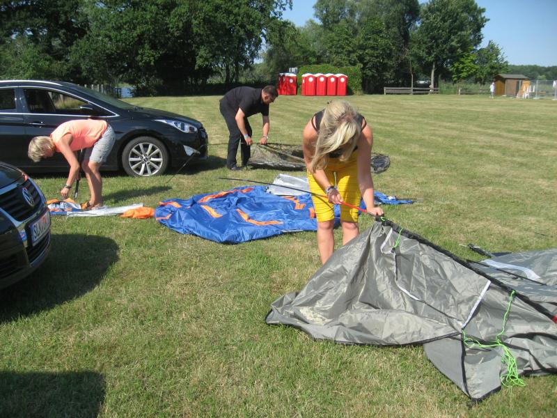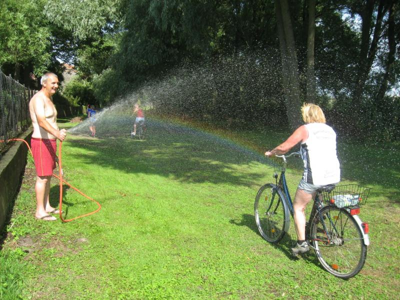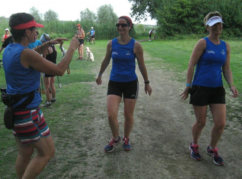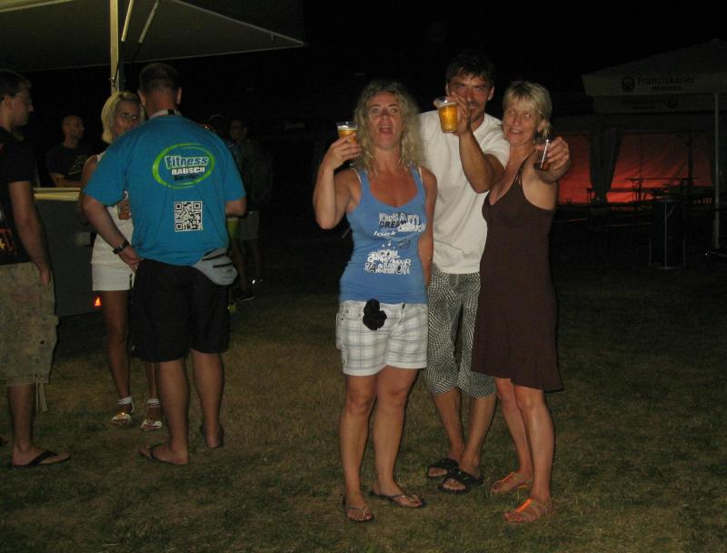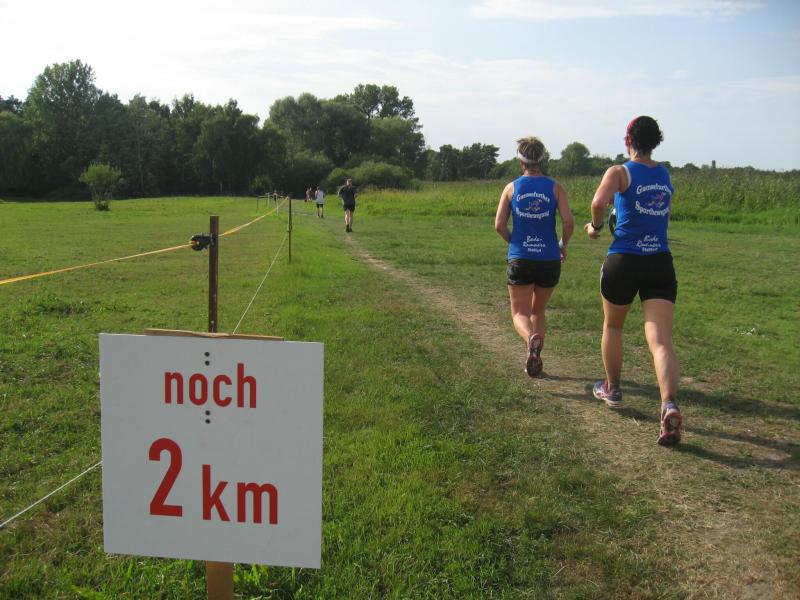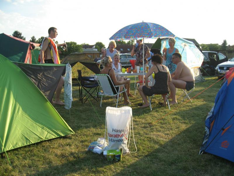 Nachdem in acht Zelten Quartier bezogen wurde, standen der Lauferei, dem Radfahren und natürlich dem grenzenlosen Badespaß im Hohennauener See nichts mehr im Wege. Den ultimativen Höhepunkt des Trainingslagers bildete der 3-Seen-Lauf am Nachmittag des zweiten Tages. Bereits beim Frühstückslauf am Morgen war den Lauffreunden klar: Heute wird es wieder sehr heiß! So gönnten sich die Sportler nach dem reichhaltigen Frühstücksbüfett im nahegelegenen Hotel ein paar faule Stunden am See. Auch der Veranstalter hatte bereits vorgesorgt und den langen Kanten über 25 Kilometer kurzerhand gesperrt. Weiterhin erleichternd kam hinzu, dass der 3-Seen-Lauf ohnehin auf jegliche Zeit- und Altersklassenwertung verzichtet. Mit der Bitte das Lauftempo den Temperaturen anzupassen, erfolgte um 15 Uhr der entgegengesetzte Start über die acht und 21 Kilometer. Während die Kurzstrecke ihre vier Kilometer bis zum Wendepunkt am bewaldeten Seeufer absolvierte, schienen die Laufschuhe auf den ersten vier Kilometern der Langdistanz am heißen Asphalt kleben zu bleiben. Der Verpflegungspunkt bei Kilometer fünf war allerhöchste Eisenbahn. Das Wasser kippte becherweise über die erhitzten Körper. Wem das nicht reichte, Schuhe aus und rein in den See! Weitere heiße fünf Kilometer auf dem Deich folgten, bevor die restlichen elf vorrangig auf angenehm kühleren Waldwegen zu absolvieren waren. Den Radfahrern als ständige Begleiter der Strecke, war sogar das Wechseln auf die Laufstrecke erlaubt. Doch alle Bode-Runner-Läufer hielten in ihrem Element tapfer durch und auch die Fahrrad-„Gäste“ klopften sich am Ende stolz auf die Schultern.