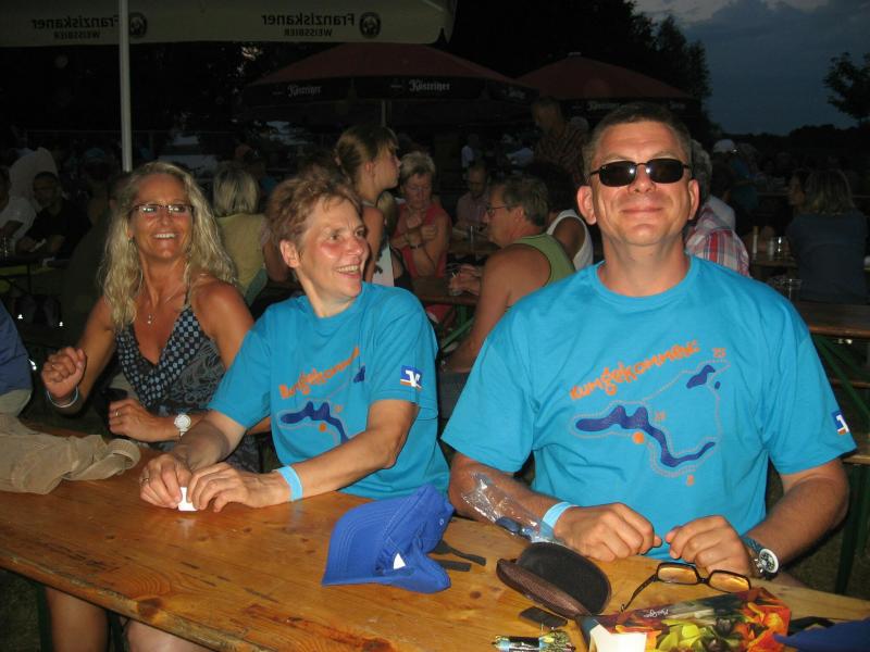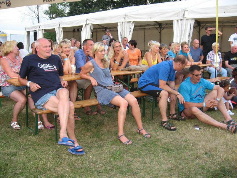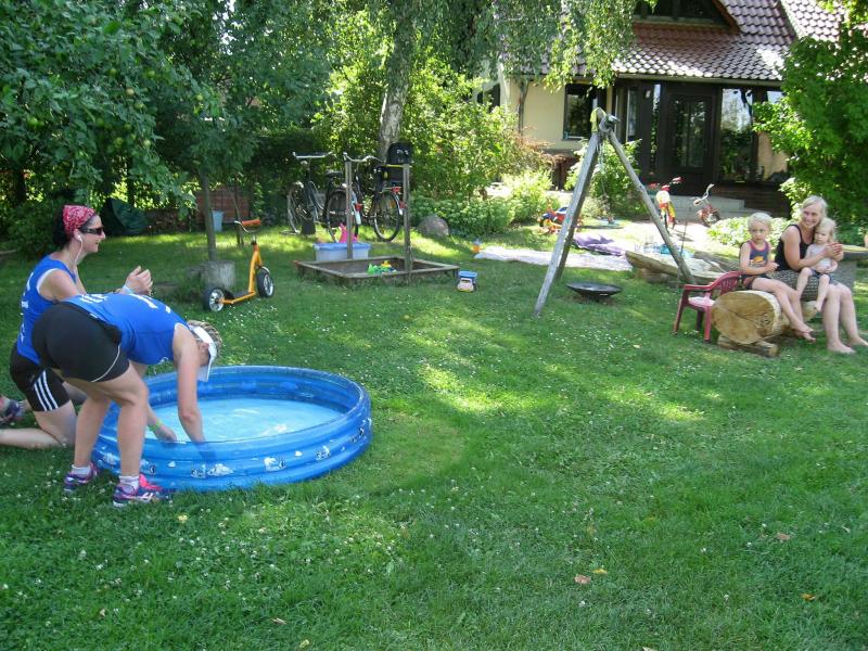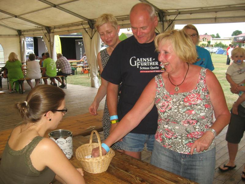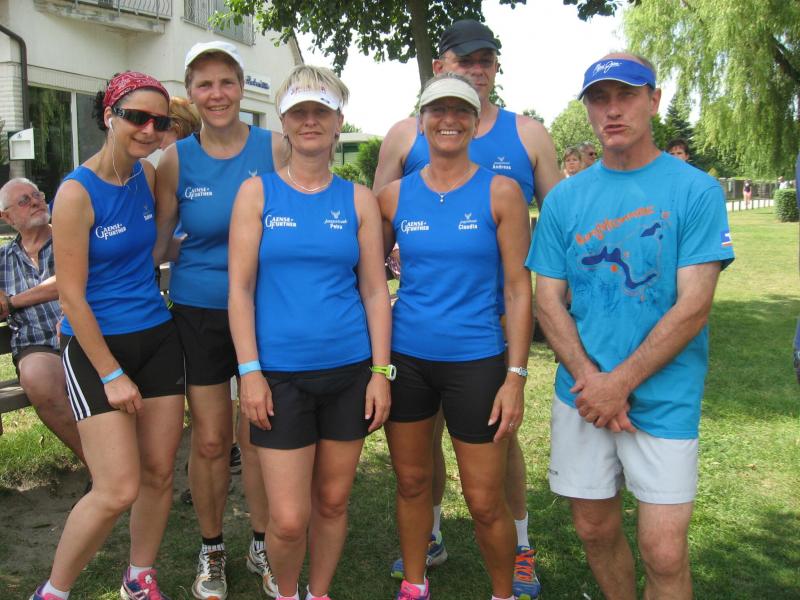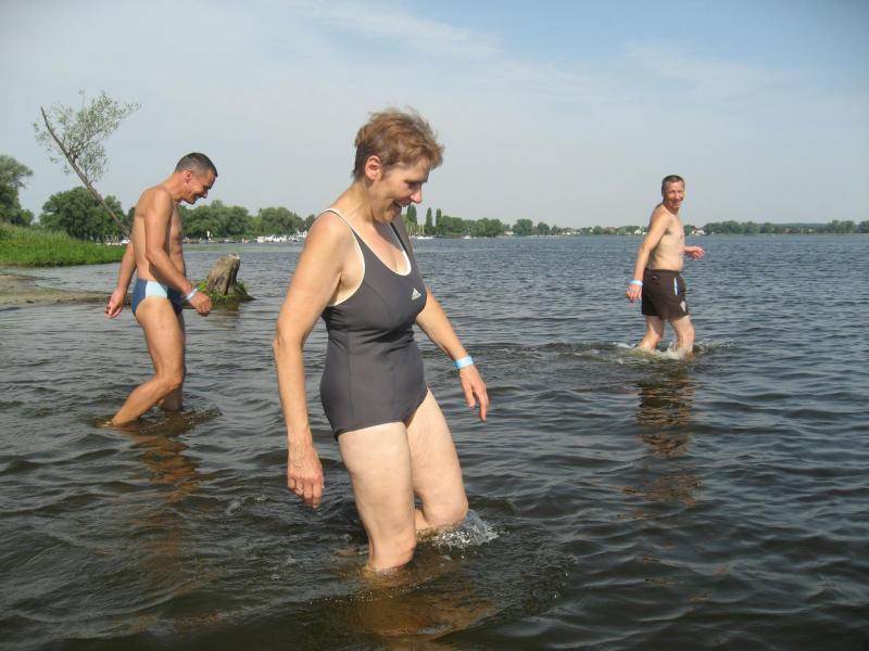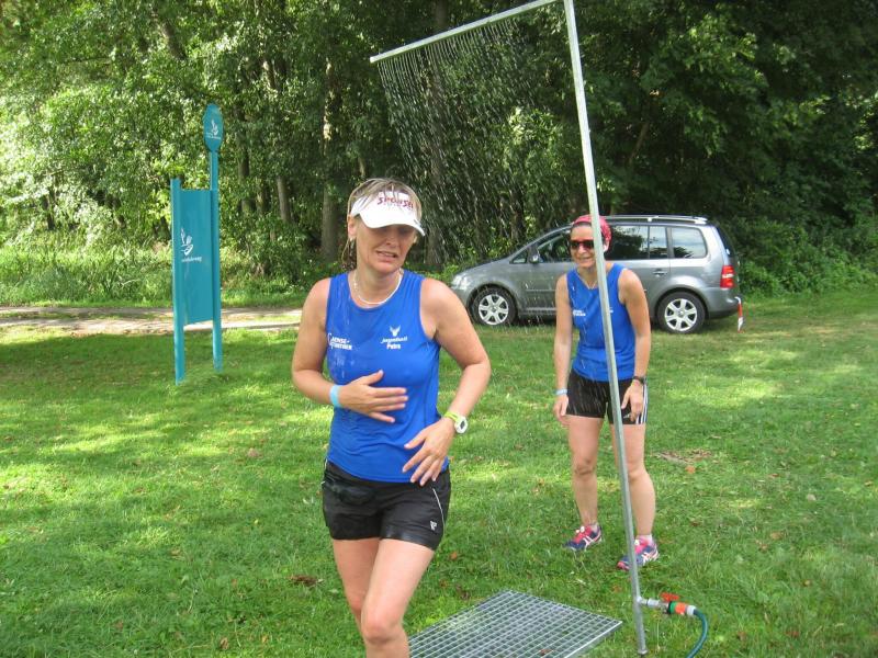 Nach dem Empfang einer schicken Erinnerungsmedaille und etlichen erfrischenden Melonenstückchen hieß es erneut: Schuhe aus und rein in den See! Auf Grund der Streckenkürzung steht bei den Gaensefurthern die Umrundung des dritten Sees nach wie vor aus. Die Teilnahme in 2014 wird damit quasi Pflichtprogramm.