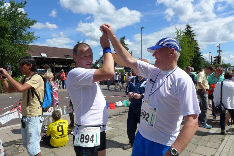 Mit Frank Schauer (Deutscher Meister 2014 im Marathon) und Yves Löbel (2-facher Sieger beim Magdeburg Marathon), waren auch wieder zwei prominente Größen für den Zehn-Kilometer-Lauf am Start. Nur drei Minuten hinter den Frauen wurde die für den Autoverkehr gesperrte Strecke freigegeben. Eine Aufholjagd begann und an engen Passagen hatten die Profis ihre Mühe sich an den Aktiven vorbei zu kämpfen. Für den Wertungslauf der Frauen war das nicht uninteressant, machte es den ohnehin flotten Kurs noch schnellfüßiger. So angestrengt, war eine Runde auch vollkommen ausreichend bei diesen warmen Temperaturen. Nur die Männer mussten auf ihre zweite Runde. Nur die Männer und Ina Schöler von der ZLG Atzendorf. Sie wollte schon immer einmal die Zehn-Kilometer-Strecke in Magdeburg laufen. Außerhalb der Wertung, verzichtete sie damit vielleicht sogar auf einen Pokalsieg über die Kurzstrecke. Das Feld hatte sich inzwischen weit auseinander gezogen. Viele Läufer wollten einfach nur noch den Lauf über die Ziellinie bringen. Ein zu starkes Anfangstempo forderte unter Umständen nun Tribut, viele verbuchten aber auch neue Bestzeiten und sammelten somit wichtige Punkte für die Cupwertung. Bode-Runner Sylvia Köhn ist wieder vorne mit dabei und belegte in ihrer Altersklasse einen zweiten Platz. Schlussendlich kamen alle Teilnehmer gesund in das Ziel. Eine erfrischende Dusche, extra zum Jubiläumslauf abgefülltes „Colbitzer“ und unzählig geschmierte Schmalzstullen entlohnten für alle Strapazen.