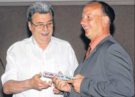 Zunächst hatte es beim 1. Sportsymposium des Sportbunds in Staßfurt locker und unterhaltsam angefangen. Zum Beispiel hielt Frank Hengstmann, Kabarettist aus Magdeburg, eine Laudatio mit vielen Textteilen zum Schmunzeln auf den scheidenden Westeregelner, der inzwischen in Borne wohnt. Doch nachdem auch KSBPräsident Detlef Gürth sich für die jahrelange und aufopferungsvolle Hingabe von Maruhn bedankte („Wir werden dich vermissen.“) und schließlich auch der symbolische Staffelstab von Maruhn an Thomas Gruschka, seinen Nachfolger, übergeben wurde, geriet die Gefühlswelt des Ausgezeichneten immer mehr in Aufruhr. Und als er sich schließlich bei seiner Frau Brigitte, die an diesem Tag auch noch Geburtstag hatte, für ihre jahrelange Unterstützung bedanken wollte, überwältigten ihn die Emotionen. „Ihr habe ich praktisch alles zu verdanken.“ Allerdings versagte die Stimme nur kurz, denn zur Eröffnung des Büfetts – quasi seiner letzten offiziellen Amtshandlung – war Maruhn wieder in gewohnter Manier zum Scherzen aufgelegt, unterhielt sich noch lange mit den Menschen, die ihn in seinem Leben begleitet haben und nahm viele Geschenke, Präsente und vor allem Erinnerungsstücke aus seiner aktiven Zeit entgegen.
