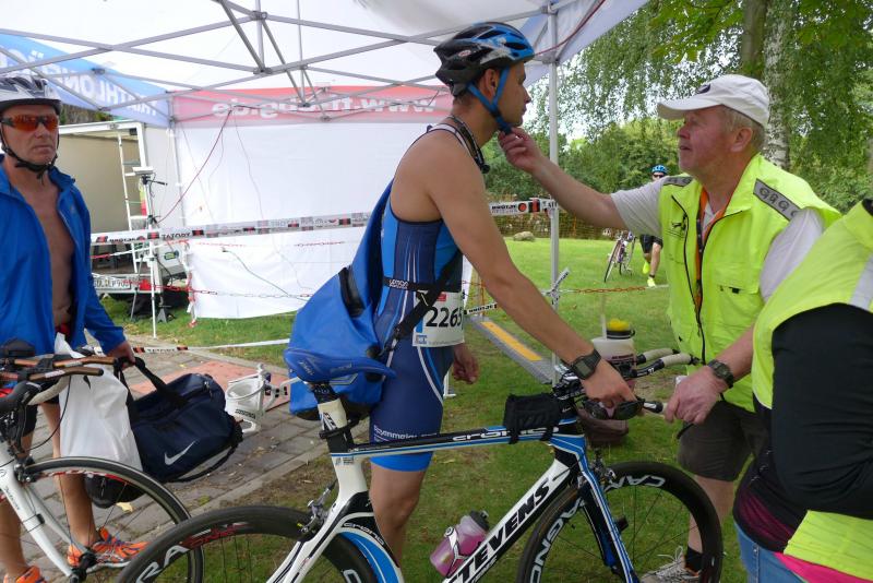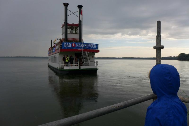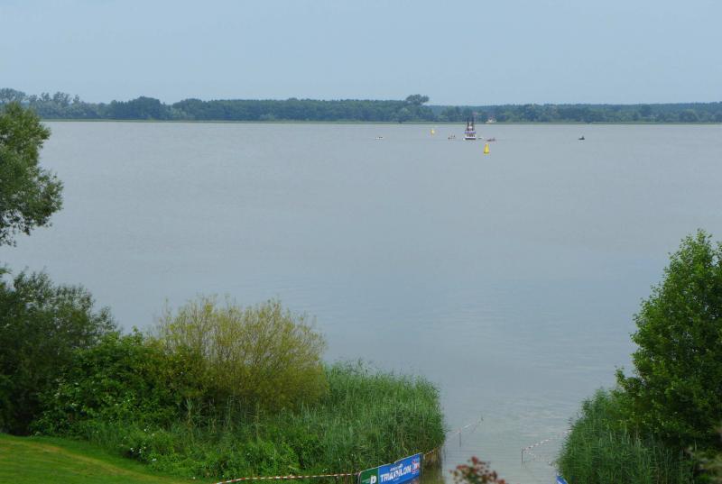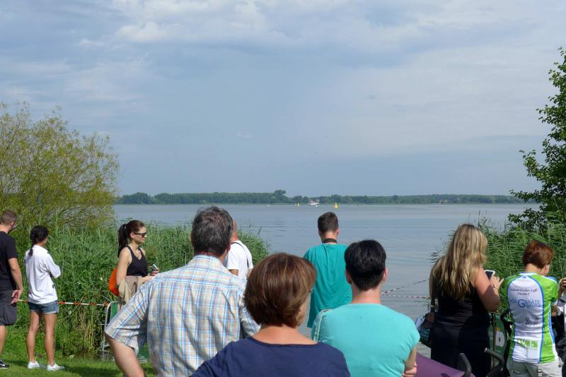 In der langen Warteschlange zur Abholung der Startunterlagen ging der Blick oft nach oben. Dicke Regenwolken thronten am Himmel und entleerten sich immer wieder in kleinen Huschen über den Arendsee. Die Teilnehmer der olympischen Distanz hatten den Kampf mit den Elementen aus dem Vorjahr noch gut in Erinnerung. Haarscharf entkamen sie damals dem tobenden See, was für einige bereits nach der Schwimmdistanz das unwiderrufliche Aus bedeutete. So bestand der Veranstalter in diesem Jahr auch wieder auf die Badekappenpflicht. Nur mit diesem auffallenden Utensil ausgestattet, war der Zutritt zum Schaufelraddampfer „Queen Arendsee“ freigegeben. Promi Antje Buschschulte begleitete als Zuschauerin und zum Daumen drücken ihren Ehemann Helge Meeuw auf der „Queen“. Während der Fahrt zum Start, lauschten die Teilnehmer angespannt den letzten Hinweisen der Wettkampfleitung. Dann ging alles ganz schnell.