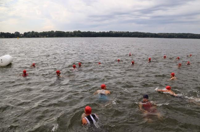 Nach einem Sprung in das kühle Nass sortierten sich die Schwimmer an der gedachten Startlinie. Ohne Neoprenanzug und mitten im See ausgesetzt, galt es nun das 1,5 Kilometer entfernte Ufer zu erreichen. Von den drei Startern der Gaensefurther Sportbewegung entkam Janko Schlenker als erster dem nassen Element. Trotz schlechterer Radzeit konnte er seinen Vorsprung vor Thomas Vetter über die Ziellinie retten. Vetter finishte nur 10 Sekunden hinter Schlenker. Als dritter im Bunde, beendete nach 2:44:10 Stunden Christian Anders ebenfalls seine olympische Distanz. Neben der Schwimmstrecke lagen 40 Kilometer Rad und eine Zehn-Kilometer-Laufrunde um den See hinter ihm.