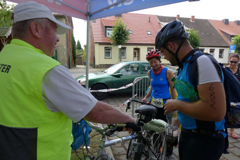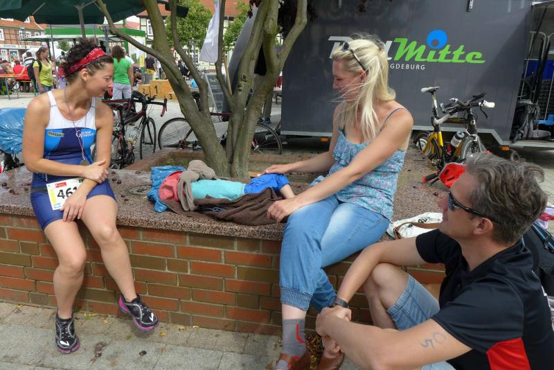 Erst um 13.00 Uhr wurde es dann auch für die 133 Starter über die Jedermann-Distanz ernst. Für den Newcomer Thomas Mohr aus Löderburg, sollte der Triathlon in Arendsee ein unvergessenes Erlebnis werden. Hier war Sabine Börner in ihrem Element, denn nichts liegt ihr mehr, als Debütanten vom Sport zu begeistern. Herrlich unwissend, nahm Mohr dankend jeden Hinweis an, zumal Zeitvorgaben keine Rolle spielten und lediglich das Überqueren der Ziellinie als Maßstab galt. Ein letztes Mal brachte sich die „Queen Arendsee“ in Position und als Mohr seine Brille nach dem Sprung ins Wasser wieder auf der Nase platziert hatte, ging es auch schon los. Die Wellen hielten sich zurück und auch die Brille hielt bis zum anvisierten Ufer. Jens-Uwe Börner wechselte nach dem Schwimmen 15 Sekunden eher auf das Rad als Sabine – ein Schock, dass gab es im Triathlonkampf der Eheleute noch nie! Auf der 20 Kilometer langen Radstrecke begegnete man dem Debütanten Mohr dann zwei Mal. Das schwere Mountainbike erinnerte Börner an seine ersten Triathlon-Starts und die mitgenommene Capri-Sonne ließ Sabine immer noch leicht schmunzeln. Beruhigend, dass sich Mohr für die anstehende Fünf-Kilometer-Laufeinheit noch ein paar Sahnebonbons als Energiereserve bereit gelegt hatte. Beide Börners hatten es fast geschafft, da wechselte auch Mohr auf die Laufstrecke. Während die Wartenden im Zielbereich den rührenden Heiratsantrag eines Triathleten-Pärchens verfolgen konnten, war für Mohr Durchhalten angesagt. Und wie er durchhielt! Gepuscht durch die Sprecheransage und dem Applaus der vielen Zuschauer, legte Mohr auf der langen Zielgeraden einen sehenswerten Schlussspurt hin. Da wurden Reserven mobilisiert, die zweifellos ausbaufähig sind! Ein überglücklicher Thomas Mohr feierte seinen ersten Triathlon und die Sportler der Gaensefurther Sportbewegung feierten gerührt mit. Trotz Aussicht auf einen heftigen Muskelkater vereinbarten die Finisher eine Neuauflage im nächsten Jahr.
