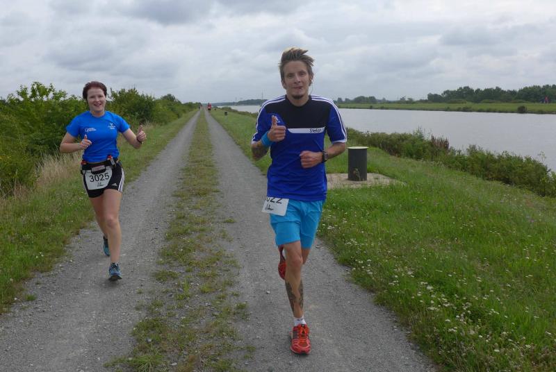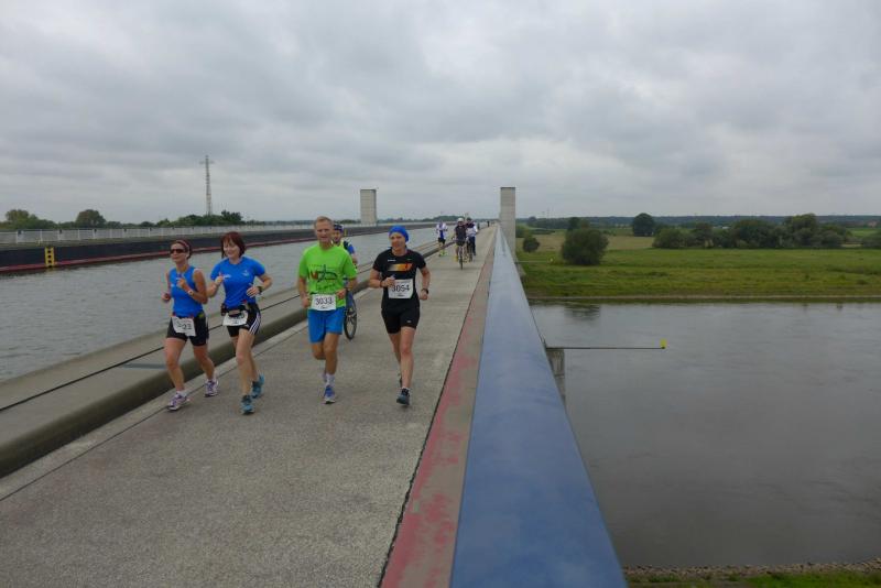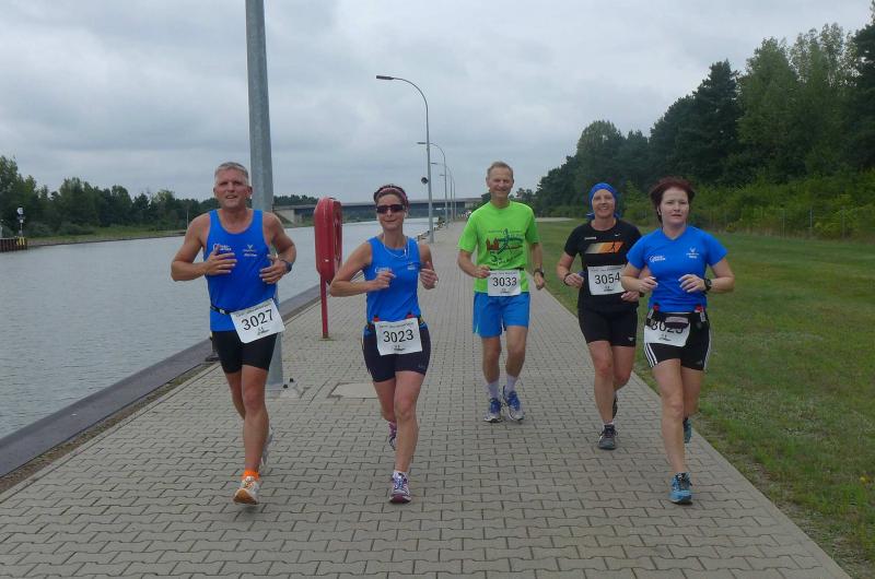 Sie konnten sogar Sachsen-Anhalts Sportminister Holger Stahlknecht und Wolmirstedts Bürgermeister Martin Stichnoth begeistern. Wer von den beiden den Finger am Abzug der Startpistole hatte, war nicht genau zu erkennen. Gemeinsam schickten sie die 88 Teilnehmer auf die 30-Kilometer-Distanz, unter ihnen auch sechs Läufer der Gaensefurther Sportbewegung. Auf unbekanntem Terrain ging es zunächst auf einem mittelalterlichen Pflasterweg durch das Wäldchen „Küchenhorn“. Über holprige Wiesenwege hinweg, stand dann auch schon der Anstieg zum Mittellandkanal an. Mit Rückenwind ging es nun immer geradeaus am Kanal entlang. Von links grüßte der „Kalimadscharo“ aus Zielitz und bald war auch die gigantische Trogbrücke passiert. An der Niegripper Doppelschleuse ging es allen Bode-Runners noch richtig gut und Jens-Uwe Börner, wieder einmal als Paparazzi unterwegs, erhaschte sogar ein Foto vom Führenden Frank Schauer. Der Deutsche Marathonmeister vom Sportclub Magdeburg war bereits wieder auf dem Rückweg und sollte am Ende nach nur 01:49:35 Stunden seinen Sieg über die 30 Kilometer-Distanz feiern. Ein gutes Training für seinen nächsten Marathon in Frankfurt, die Bode-Runners werden auf jeden Fall wieder die Daumen drücken!