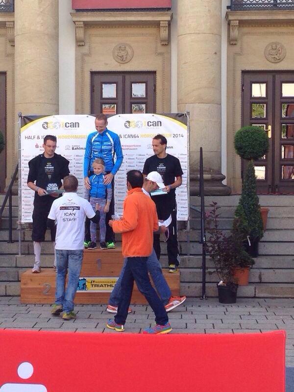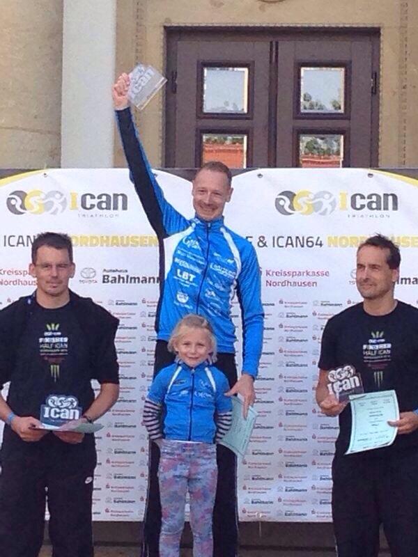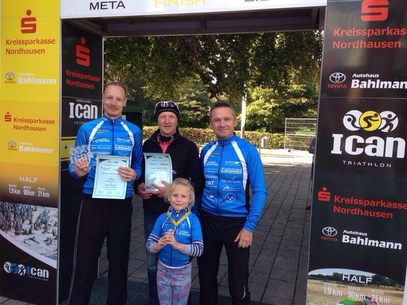 Insgesamt warteten 165 Starter aus 10 Nationen auf den Startschuss. Ein lauter Knall und das Wasser des Sundhäuser Sees begann zu schäumen. Zwei Runden mit einem kurzen Landgang waren zu absolvieren. Die Triathlonprofis wie Georg Potrebitsch oder Markus Liebelt benötigen für die 1,9 km ca. 25 min. Von den Gaensefurthern lief Ralf Rosenmeier nach 34 min als erster in die Wechselzone. Eine Minute später folgte Steffen Fleischer und kurz drauf verließ auch Torsten Blauwitz das Wasser. Alle drei lagen gut platziert im Mittelfeld und nun ging es auf die anspruchsvolle 90 km lange Radstrecke. Der Wind hatte inzwischen aufgefrischt und machte den ohnehin schon schweren Radpart noch anspruchsvoller. Eine große und eine kleine Runde im Harzer Vorland waren zu absolvieren bevor man die Wechselzone in der Nordhäuser Innenstadt erreichte. Alle drei Gaensefurther kamen mit den Bedingungen gut zurecht. Blauwitz fuhr am weitesten im Feld nach vorn und stellt nach 2:31:03 h Fahrzeit sein Rad in der Wechselzone vor dem Nordhäuser Theater ab. Im Nachgang zeigte er sich nicht ganz zufrieden mit seiner Radleistung "Das geht noch besser, aber das Streckenprofil war sehr schwierig und der Wind blies ordentlich. Ich wollte nicht schon alle Körner auf der Radstrecke verschießen, weil ich wusste, da kommt noch ein anspruchsvoller Halbmarathon mit ordentlich Höhenmetern.". Rosenmeier absolvierte die 90 km auf dem Rad ohne Probleme in 02:42:29 h. Das Radfahren ist seine Stärke und für ihn begann mit der Laufstrecke der schwierigste Part an diesem Tag. Zu laufen waren 4 Runden durch die Nordhäuser Innenstadt. Rosenmeier: "Ich wusste der abschließende Lauf wird hart, aber wir haben gut trainiert. Der Laufkurs ging ständig hoch und runter und die letzte Runde hat mir alles abverlangt. " Für Fleischer begann mit dem Lauf seine stärkste Disziplin. In Vorbereitung auf eine weitere Halbdistanz in zwei Wochen in Binz absolvierte er den Halbmarathon in 1:35:01 h. "Ich habe mich ganz kurzfristig entschlossen hier zu starten. Ich bin zufrieden mit dem Ergebnis und freue mich jetzt auf Binz." Die Körner, die Blauwitz auf der Radstrecke sparte, brauchte er jetzt auf dem Halbmarathon. "Es lief von Anfang an gut und ich kam gut in meinen Rhythmus. Mit den 1:30:31 h bin ich angesichts der schweren Laufstrecke voll und ganz zufrieden."