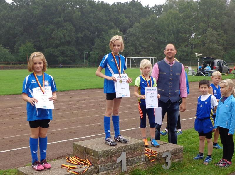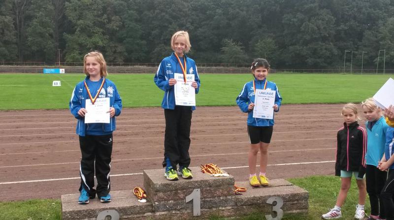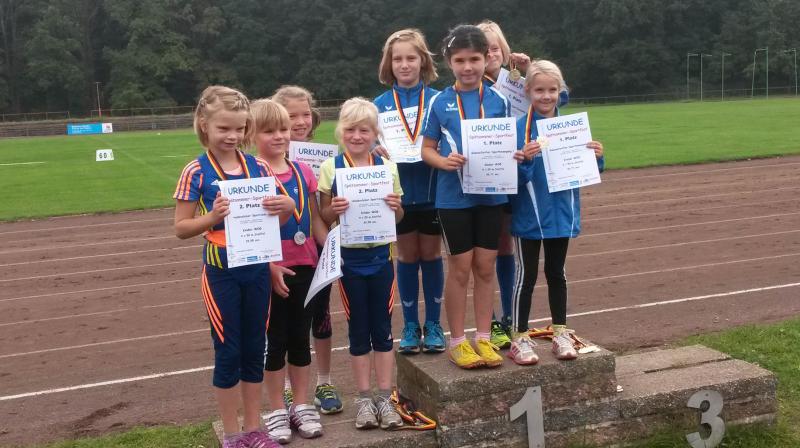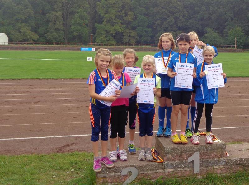 Die achtjährigen Mädchen des Vereins haben sich inzwischen zu einer Macht entwickelt. Michelle Otto glänzte dreimal mit Platz eins: im 50m Lauf, Weitsprung und 800m Lauf. Nur im Schlagballweitwurf musste sie drei Konkurrentinnen den Vortritt lassen, obwohl sie mit 22,07 Metern ihre PB um 3,5 Meter verbessern konnte. Eine der Konkurrentinnen war ihre Schwester Laura. Sie schaffte außer im Schlagballweitwurf mit 22,60 Meter (3.) auch im Weitsprung (2.) und 800m Lauf (4.) persönliche Bestleistungen und konnte zwei Mal zusammen mit Michelle einen Podestplatz einnehmen. Die Siegerin im Schlagballweitwurf hieß wie nun schon so oft Nina Ritter. Ein weiterer vorderer Platz gelang ihr im Weitsprung (3./PB), wo das Podest somit vollständig in Gaensefurther Hand war. Im 50m Lauf wurde Nina Fünfte und im 800m Lauf Siebte. Weil Fabienne Sämisch größenmäßig oft Nachteile gegenüber Gleichaltrigen hat, muss sie sich besonders anstrengen, um mithalten zu können. Das gelang ihr gut, aber für einen Spitzenplatz reichte es diesmal mit 2 Mal Platz sechs, acht und neun nicht. Den Höhepunkt bildete für die Mädchen der Altersklasse w8 die Staffel. Mit großem Engagement waren Nina, Laura, Fabienne und Michelle bei der Sache, siegten deutlich und durften sich über die begehrten Goldmedaillen freuen.