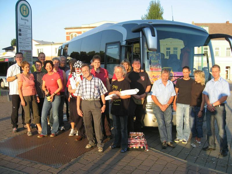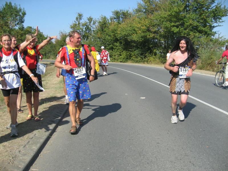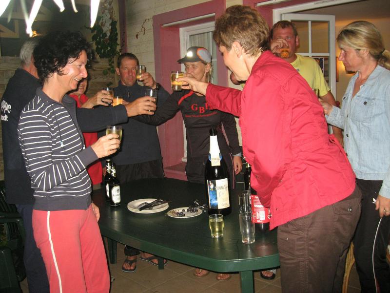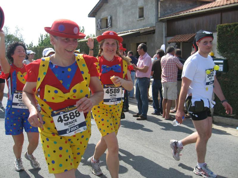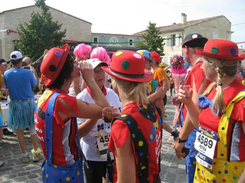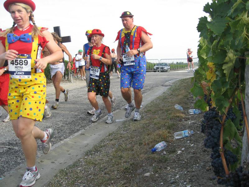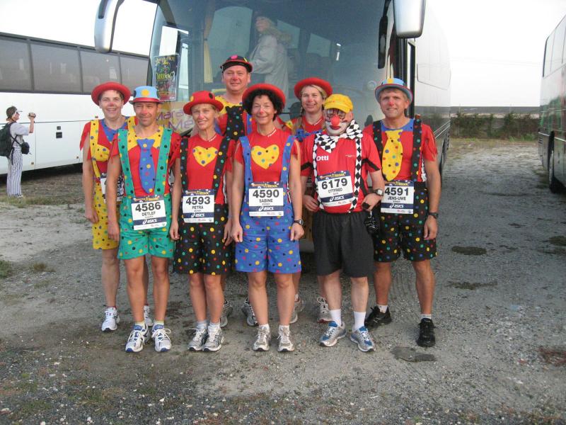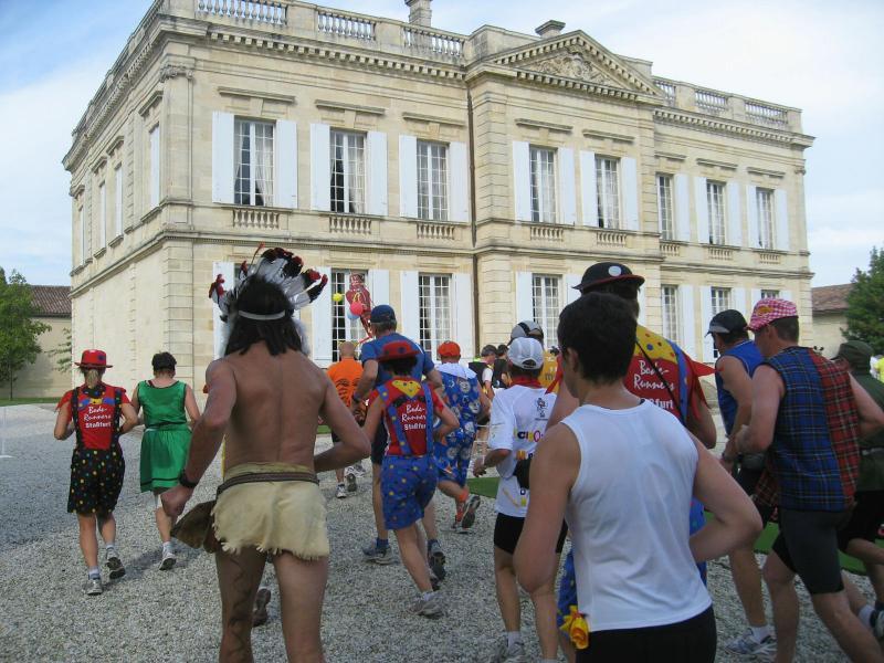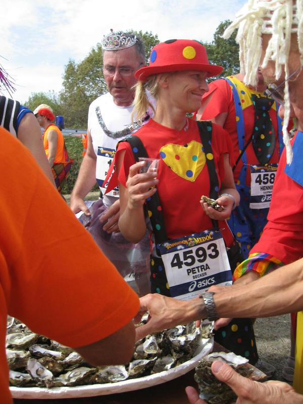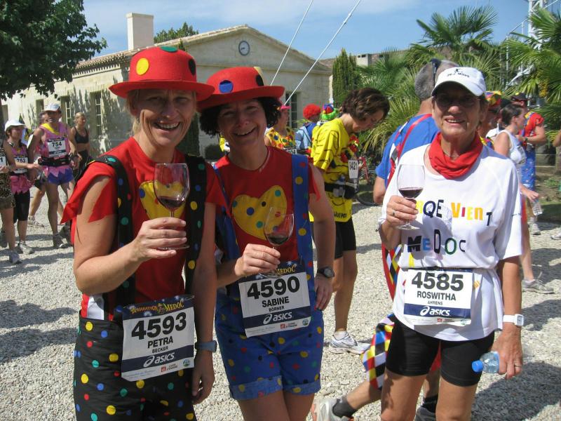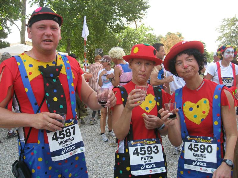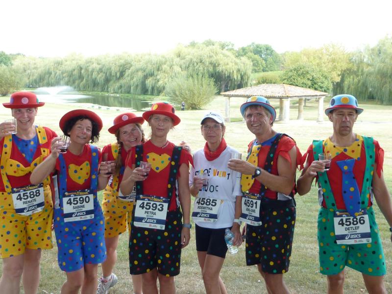 Neun Bode-Runners der Gaensefurther Sportbewegung gehörten zu den glücklichen Teilnehmern am Marathon des Chateaux du Medoc. Zusammen mit Sportlern aus Halberstadt, Aschersleben, Bernburg und Frankfurt bezog man im Feriendorf Lacanau an der südfranzösischen Atlantikküste Quartier. Ein sonnenverwöhntes Paradies unweit der Chateaus, welche sich durch die edelsten Weine dieser Erde ihren Namen machten. Erwartungsvoll begab sich die Gruppe in das Meer der knapp 9.000 Läufer und nach einem fast zwei stündigen Showprogramm, ging es dann wirklich auf die 42,195 Kilometer lange Weinverkostung. Der erste WC-Stopp erfolgte bereits vor dem ersten Kilometerschild, denn der eigene, gut gefüllte Getränkevorrat machte sich nach dem langen Stehen in morgendlicher Kälte bemerkbar. Kein leichtes Unterfangen, hatte man doch die ursprüngliche Laufbekleidung gegen ein Clown-Kostüm eingetauscht. Nachdem alle Hosenträger und Sicherheitsnadeln wieder an der richtigen Stelle waren und man inzwischen von schätzungsweise 4.000 Läufer überholt wurde, verließ die Gruppe unter dem Beifall zahlreicher Schaulustiger Pauillac. Eine Runde um die ersten Chateaus war zu absolvieren, bevor man nach 22 Kilometern den Ort wieder erreichen wollte. Ziel war, diese Strecke ziemlich zügig zu laufen, dann bei Kilometer 22 Renate Liedtke mitzunehmen und den Rest des Marathons gemeinsam zu genießen. Einen ersten erlesenen Tropfen Beychevelle gab es bereits bei Kilometer sieben. À la vôtre! Läufer aus der ganzen Welt prosteten sich genüsslich zu, die Bode-Runners vor jedem Schloss im Fotoshooting. Alle Verpflegungsstände waren üppig gedeckt. Neben frischem Obst reichte man den Läufern Salzgebäck, verschiedene Brot- und Käsesorten, Kuchen und Kekse, Trockenfrüchte, Wasser, Cola und natürlich immer wieder ein Becherchen Rotwein. Nach gut 2,5 Stunden erreichte man wieder Pauillac und Renate übernahm die Tempoarbeit. Mit den Chateaus Mouton und Lafite Rothschild nährte sich die Gruppe einem weiteren Höhepunkt. In der Parkanlage am prunkvollen Schloss, kredenzte man die edlen Tropfen natürlich in Gläsern. Eine logistische Meisterleitung für über 8.000 Läufer! Bereits mächtig dem Alkohol verfallen, ließen es sich einige Läufer nicht nehmen, im Teich der Rothschilds ein ernüchterndes Bad zu nehmen. Außer der zunehmend schwerer werdenden Beine verkrafteten die Staßfurter Läufer die ungewohnte Herausforderung bislang ohne Verluste. Eine Zielzeit von 6:30 Stunden war vom Veranstalter als Zeitlimit vorgegeben, dass müsste doch zu schaffen sein! Inzwischen war Kilometer 36 passiert, die Anstiege zu den höher gelegenen Chateaus lagen hinter den Läufern und es ging hinaus auf die Küstenstraße. Vor einem kleinen Imbisswagen drängte sich die Läuferscharr. Vom dicken Bayonner Schinken schnitt ein waschechter Franzose dünne Scheiben, die fluchs geschnappt, durch die Masse gereicht wurden. Ein leicht salziger Gaumenschmaus für den sich die kleine Pause gelohnt hatte! Nicht weit entfernt roch man bereits das nächste Highlight. Auf großen Tabletts wurden Austern mit Zitronen gereicht. Dazu servierte man den Läufern einen trockenen Weißwein. Für alle Bode-Runners eine Mutprobe die bereits im Vorfeld im Pflichtenheft aufgenommen wurde. Und eine Erfahrung, welche die meisten nicht noch einmal haben müssen. Da zog der Duft von frisch gegrilltem Rindersteak die Läufer schon eher zum nächsten Anlaufpunkt. Wer noch nicht genug hatte, konnte sich dazu auch einen feinen Cognac einschenken lassen. Nach diesen Schlemmermeilen und der brütenden Sonne sehnte man sich nach dem Ende. Nun kam auch noch ein Franzose mit einem riesigen Spiegel auf die Mädels zu. Danke, wir wissen wie es um uns gestellt ist, versuchte man zu übermitteln. Aber höflich lud er an den Straßenrand zur Auffrischung der Schminke ein, schließlich sollte beim Zieleinlauf alles perfekt sein. Nun hatte man also auch noch die Deutschlandfarben auf der Wange und nachdem alle noch ein Stieleis naschten, kamen auch die Kräfte wieder zurück. Ein Blick auf die Stoppuhr: „Das schaffen wir noch unter sechs Stunden!“ Gemeinsam genoss man nach 5:58 Stunden das Überqueren der Ziellinie, über 3.000 Läufer sollten noch folgen. Nicht umsonst spricht man vom „längsten Marathon der Welt“.