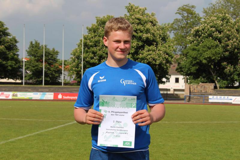 Ein langer Wettkampftag wurde es für Marek Kadereit (m13), dem einzigen Athleten von der Gaensefurther Sportbewegung, beim 13. Pfingstsportfest in Leuna. Bei bestem Leichtathletikwetter bot die ansprechende Anlage des TSV Leuna den vielen Teilnehmern sehr gute Bedingungen.