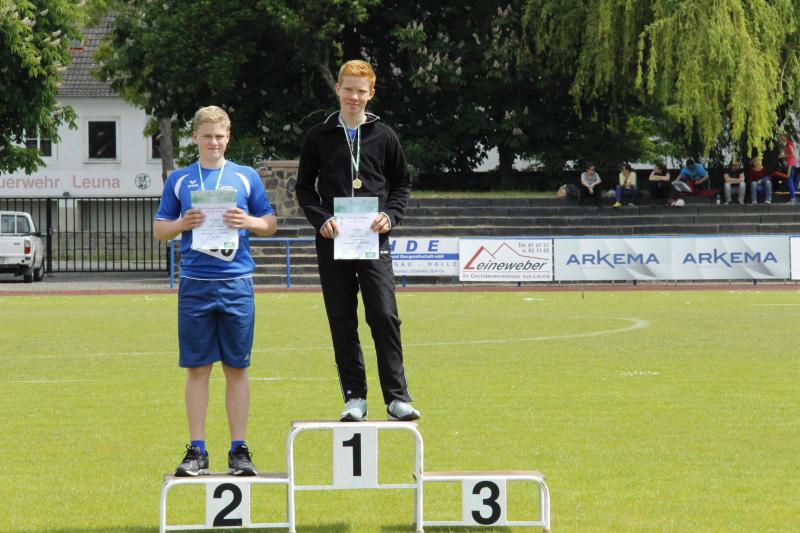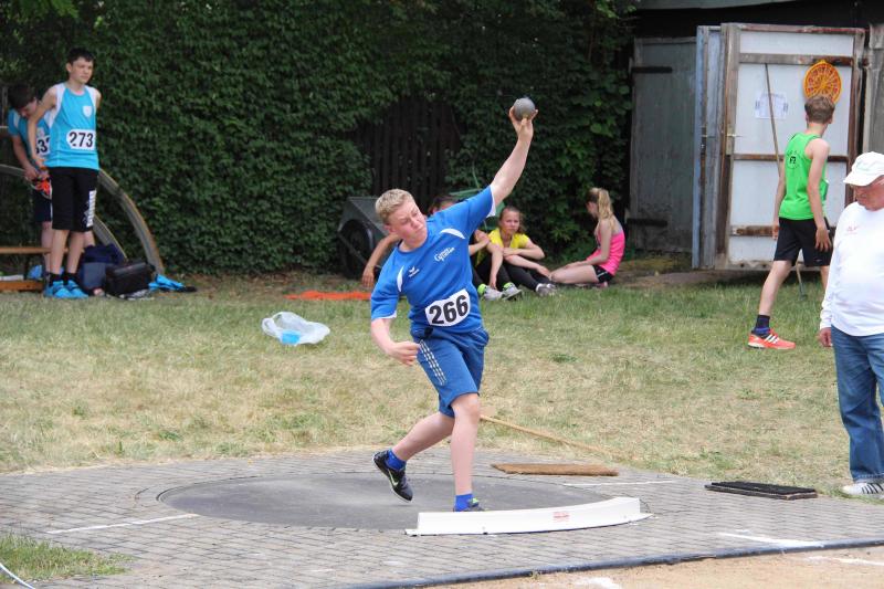 Bei der ersten Disziplin, dem Diskuswurf, musste sich Marek mit 5 Konkurrenten messen. Nach einer Woche Urlaub an der Ostsee war sein Enthusiasmus groß. Nachdem die ersten 5 Versuche im 22- bis 25 Meter-Bereich nicht seinem Anspruch entsprachen und er zwischenzeitlich sogar auf Platz 5 abrutschte, probierte er es im 6. Versuch mit einem Wurf aus dem Stand. Und siehe da- neue persönliche Bestleistung (PB) mit 28,75 m und Platz 2 im Wettkampf. Weiter kam nur Jonas Weimann von Turbine Halle.