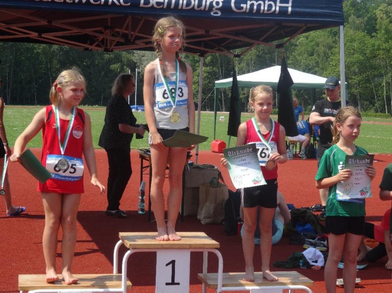 Einen sehr erfolgreichen Tag hatte auch Fabienne Sämisch (w9). Mit 3 persönlichen Bestleistungen (Ball-25,72m (2.), 50m-8,97 (3.), weit-3,19m (3.) durfte sie drei Mal auf dem Podest ihre Medaillen in Empfang nehmen.