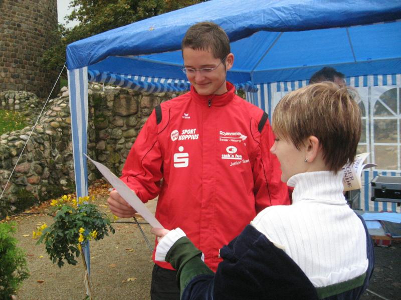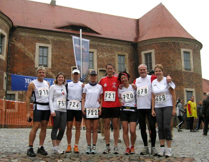 Als „Mutter aller Läufe“ unter Insidern benannt, zog sich am vergangenen Sonntag der Belziger Burgenlauf über 25 Kilometer durch die bunte Herbstlandschaft. Etwas länger als ein Halbmarathon und bergauf, bergab durch den Hohen Fläming, gingen acht Starter der Gaensefurther Sportbewegung diesen Crosslauf als letzte Vorbereitung für den Rügen-Brücken-Marathon an. Die Strecke war gut präpariert, hatte es doch am Vortag ordentlich geregnet. Und noch beim traditionellen Ehrenstart auf Burg Eisenhardt, drohten dunkle Regenwolken. Doch der guten Stimmung in dem großen Starterfeld machte dies keinen Abbruch. Bei angenehmen 12 Grad Celsius und leichtem Nieselregen ging es zusammen mit den acht Kilometerläufern auf die Strecke. Vom historischen Belziger Marktplatz mit seinen ca. 100 Höhenmetern über NN, kämpfte man sich nun allmählich bis auf 190 Meter hoch. Nur mit erhöhter Aufmerksamkeit und gegenseitiger Rücksichtnahme bewältigten die Sportler Stein- und Sandwege, Wurzelwerk oder durchnässte Grasnarben. Mitunter waren die Trampelpfade um die großen Pfützen für die hinteren Läufer nur noch gehend zu überqueren. Erleichterung für Renate Liedtke und Tina Börner, als sich die Acht-Kilometerstrecke vom restlichen Teilnehmerfeld trennte. Bevor es wieder bergauf ging, konnten sie sich auf der leicht abschüssigen Strecke erst einmal erholen. Nach nicht einmal einer Stunde erhielten sie bereits ihre Teilnehmerurkunden vom zuständigen Burgfräulein. Nun hieß es sich die Zeit zu vertreiben, bis die Langsteckler einlaufen.