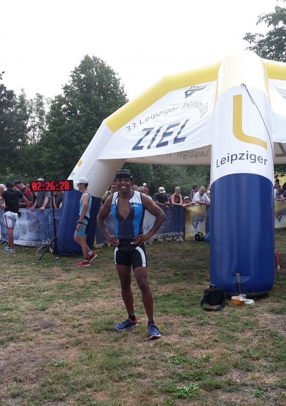 Vater Matthias hatte für sich die Olympische Distanz ausgesucht. Sie stand am Sonntag Vormittag auf dem Programm. 1550 m schwimmen, 42 km Radfahren und 10 km laufen waren für ihn angesagt. In einer Zeit von 2:24:36 Stunden überquerte er die Ziellinie, was in Altersklasse MK40 der 13. Rang war.